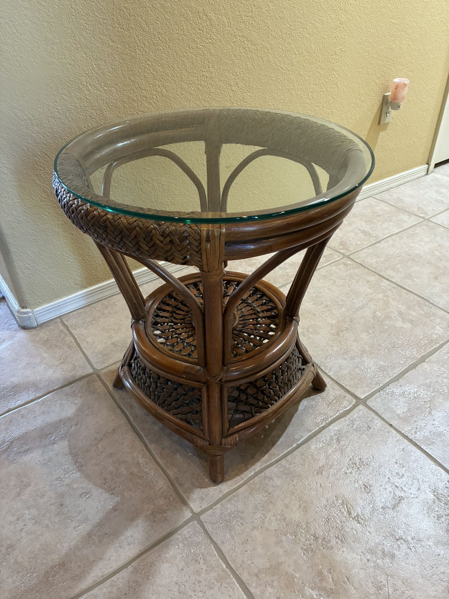 Glass top. Approximately 20” diameter. Excellent condition like new.