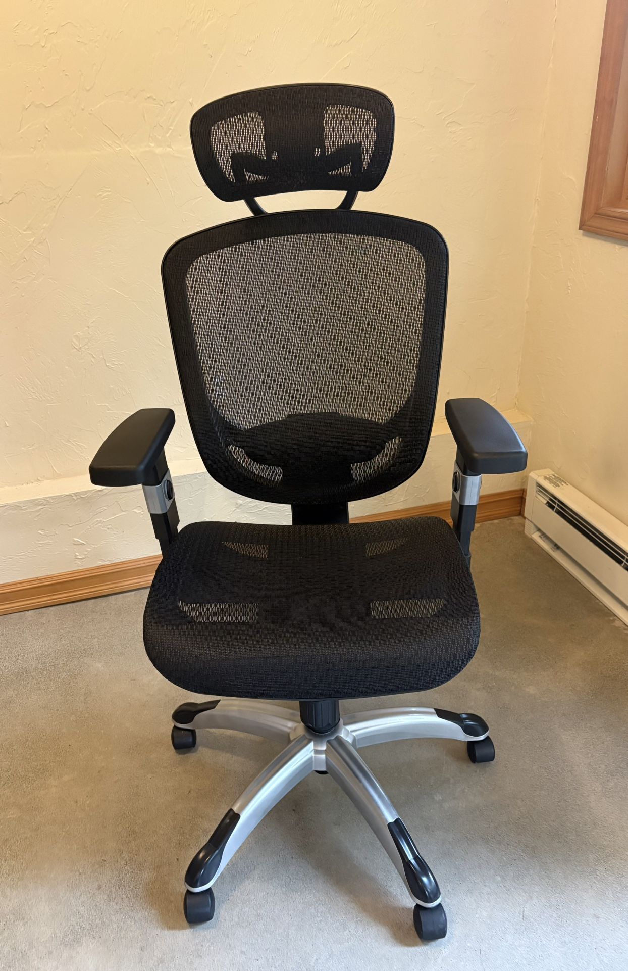 Metal frame. Mesh seat. Dimensions: 27.8 inches deep, 28.5 inches wide, 44-56.3 inches high. Weight: 28.2 pounds. Weight capacity: 275 pounds. Adjustable seat height, armrests, headrest, & reclining. Tension knob to adjust recline resistance. Good condition. Feel free to make one offer for multiple listings.