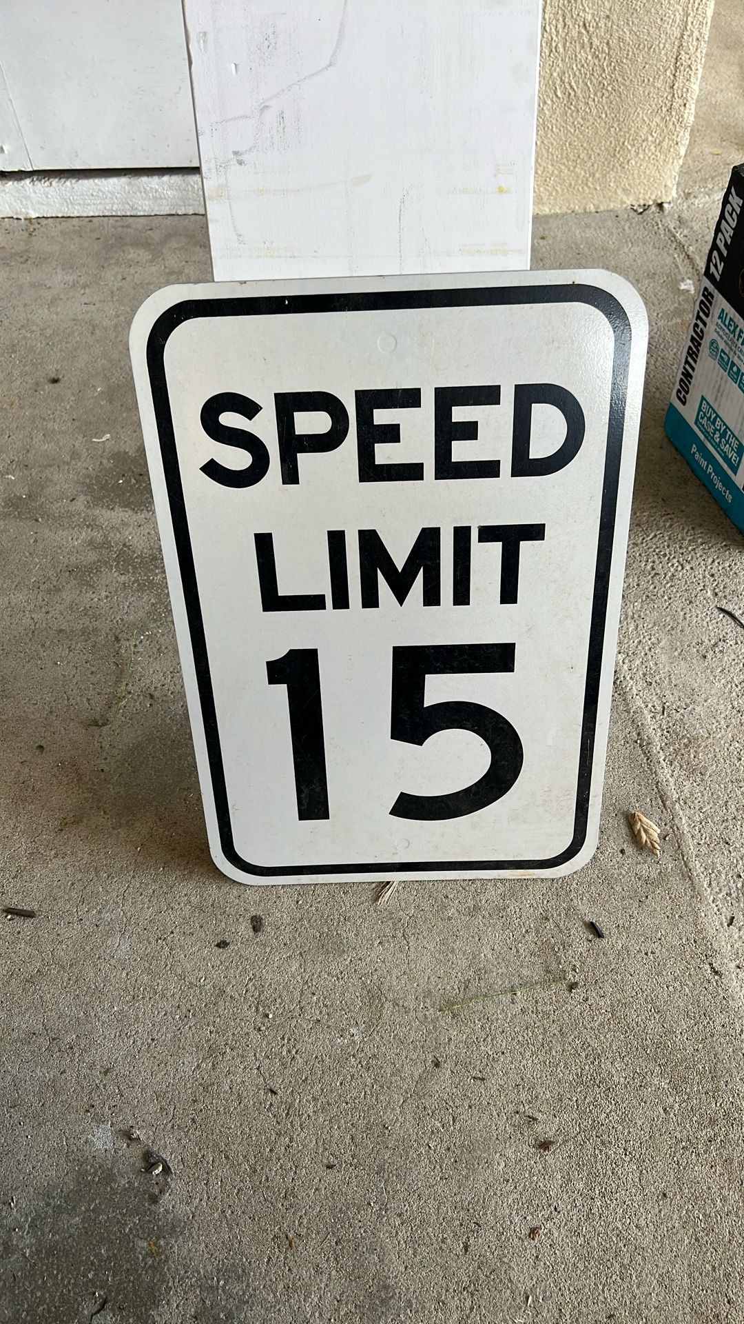 15MPH speed limit Sign 18” High x 12” wide. Never installed. Dirty from sitting around