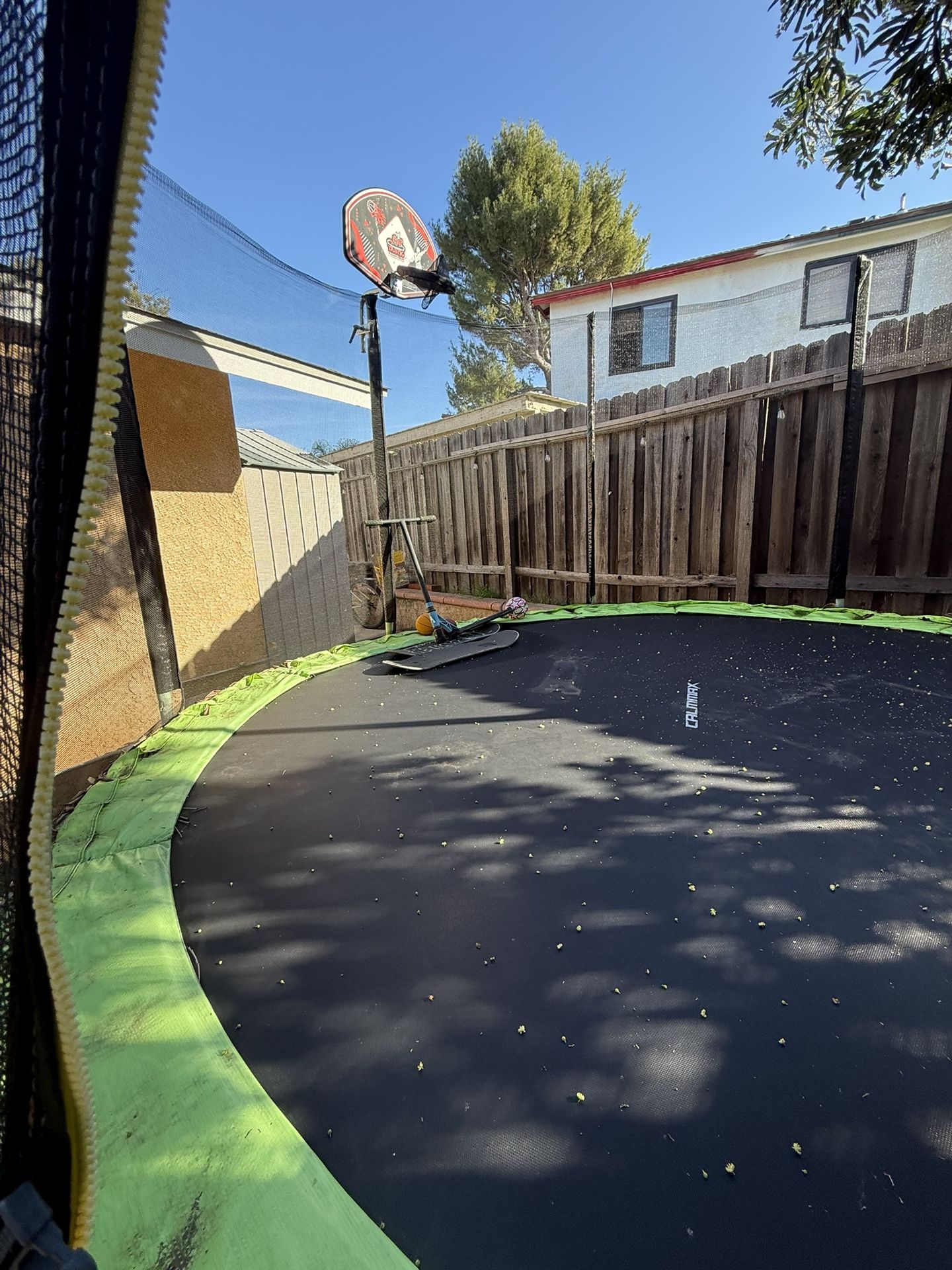 12 ft trampoline with safety net and basketball hoop. Like new.