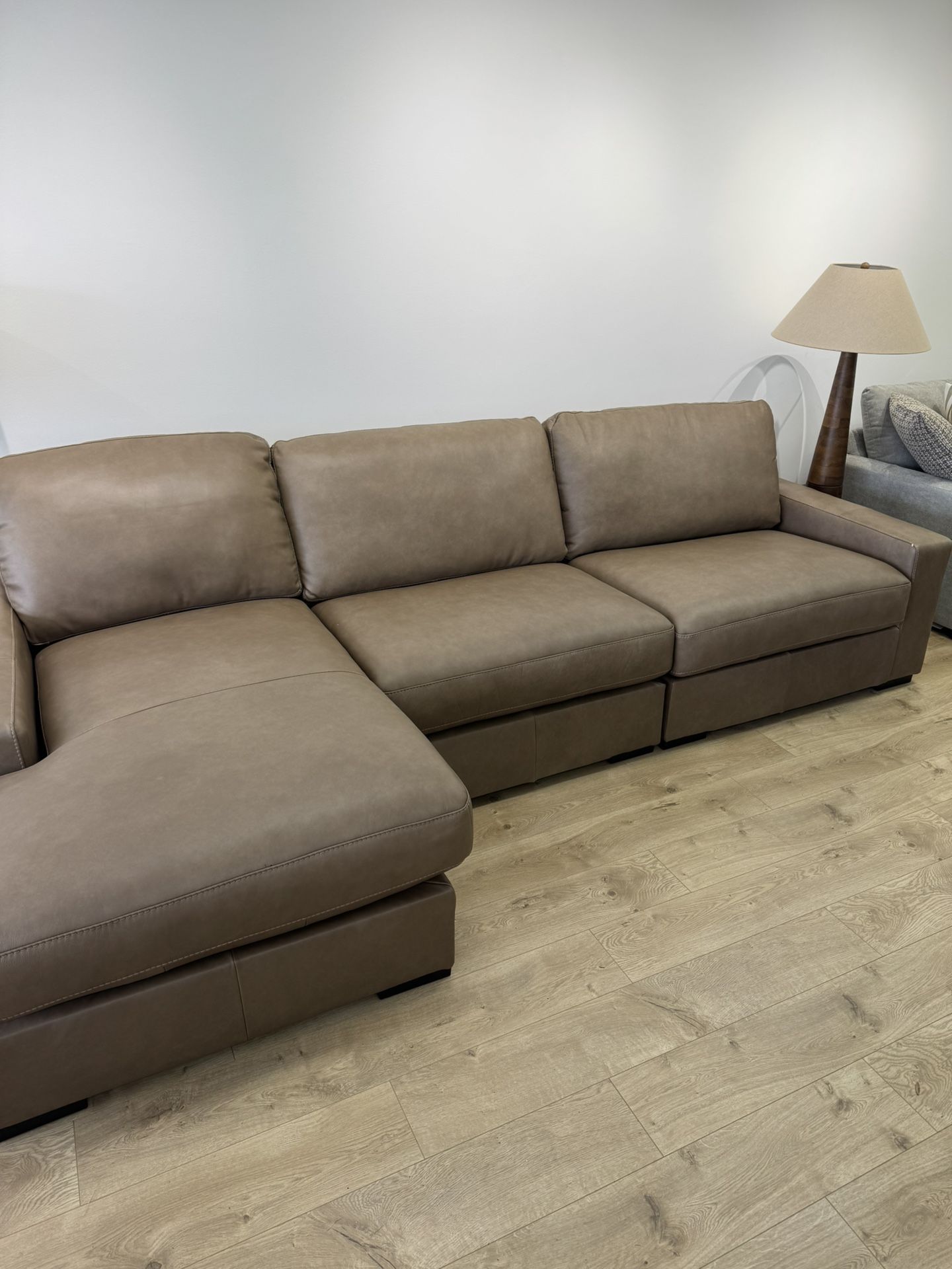 We are Fin's Furniture and you can find out even more about us by looking us up online! This leather sectional is perfect for you to relax in. You can test it out at our showroom before you buy as well. This leather features: - Free delivery - Brand new in the packaging - Loose back and seat cushions - Non slip legs - Feather blend cushions - Each piece finished on all sides - Top grain leather in all seating areas - Option to add other pieces like chaise, more armless, ottomans, etc - Size: 125 " wide x 68 " deep x 39 " high Message us to come check this out for yourself by appointment or ask us any questions here!