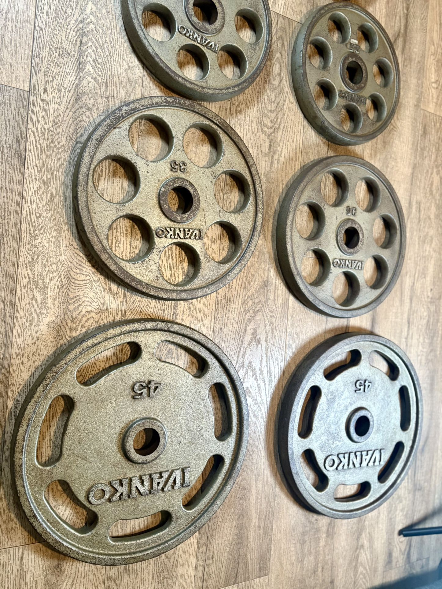 The Ivankos are gently Used. This is not cast Iron plate, this is machinated metal. A Beautiful Vintage Classic. To expensive? … look for average weight plates: pretty sure you going to find it on my profile. (2) plates 45 lbs (2) plates 35 lbs (2) plates 25 lbs (2) plates 10 lbs Total: 230 lbs.