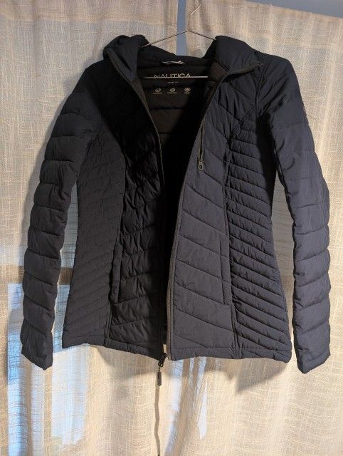 Nautica navy jacket, soft fabric, packable, ribbed design, warm, hood Gently used, great condition. Size xs