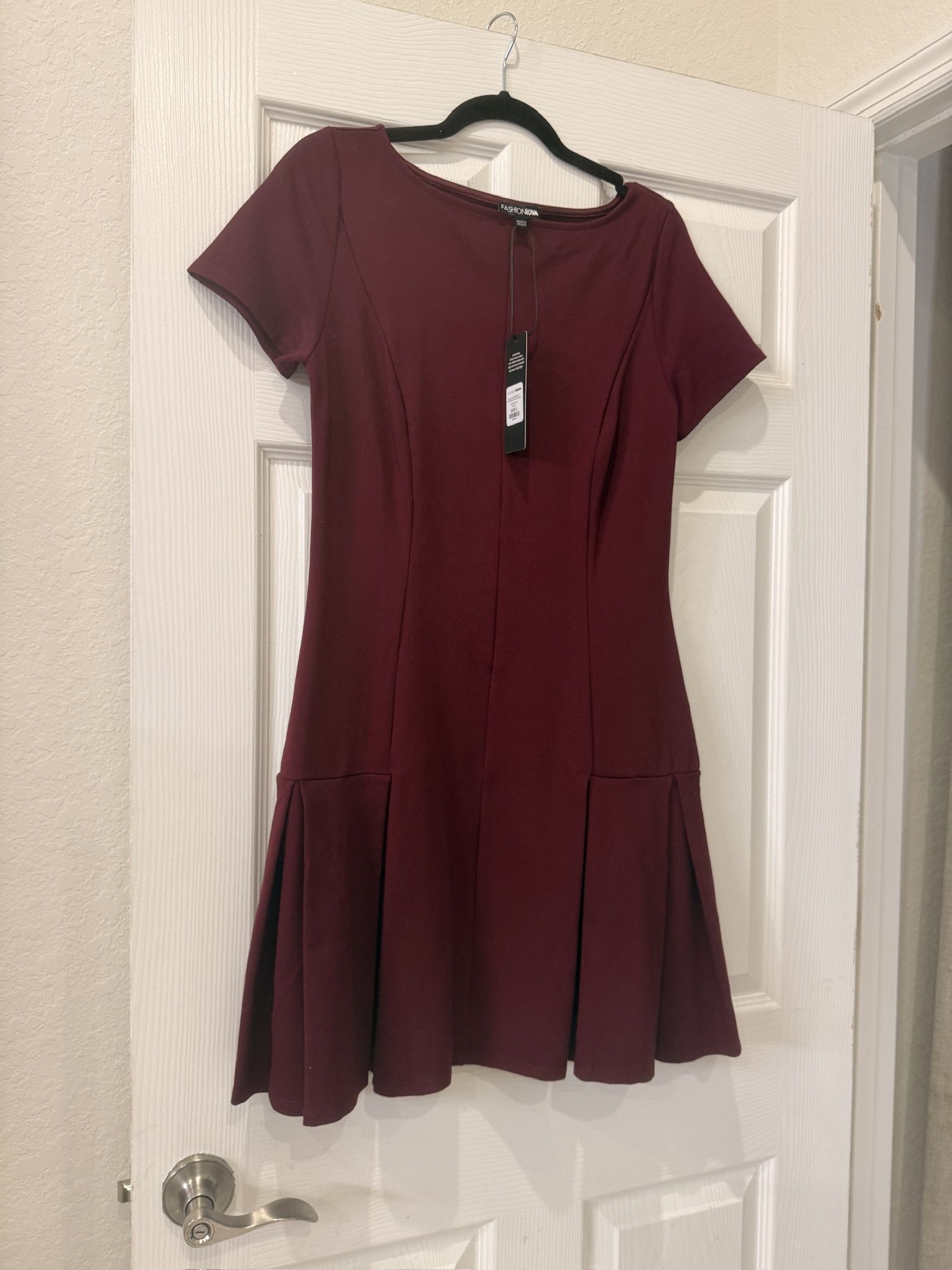 Fashion Nova Burgundy A-Line Bottom pleated Dress. Brand new with tags. Thick, stretchy Material. No zipper on back. Perfect for Christmas.