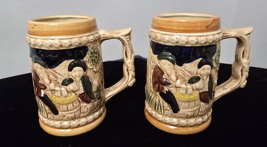 2 Available Vintage 5" Ceramic Beer Stein Mug Made in Japan. Relief Men Drinking On Barrel with Wood Shaped Handle Pre-Owned In Good Condition Pickup Is In Peculiar or Belton.