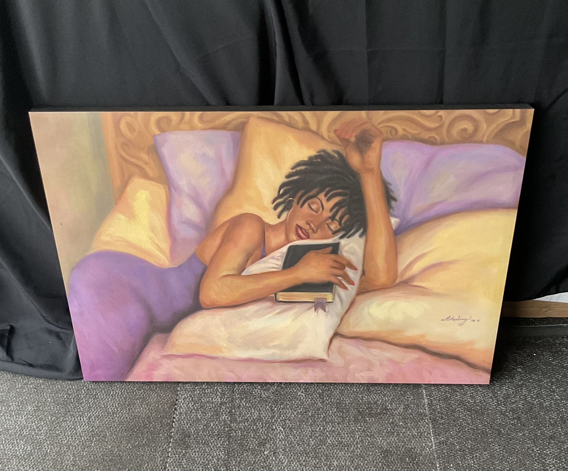 Women sleeping with bible on canvas. Size 12 x 35.5