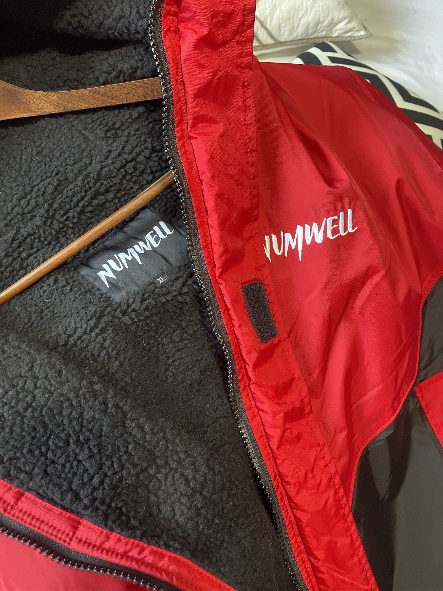 Brand new Numwell XL oversized swim parka/ changing robe, red and black, waterproof