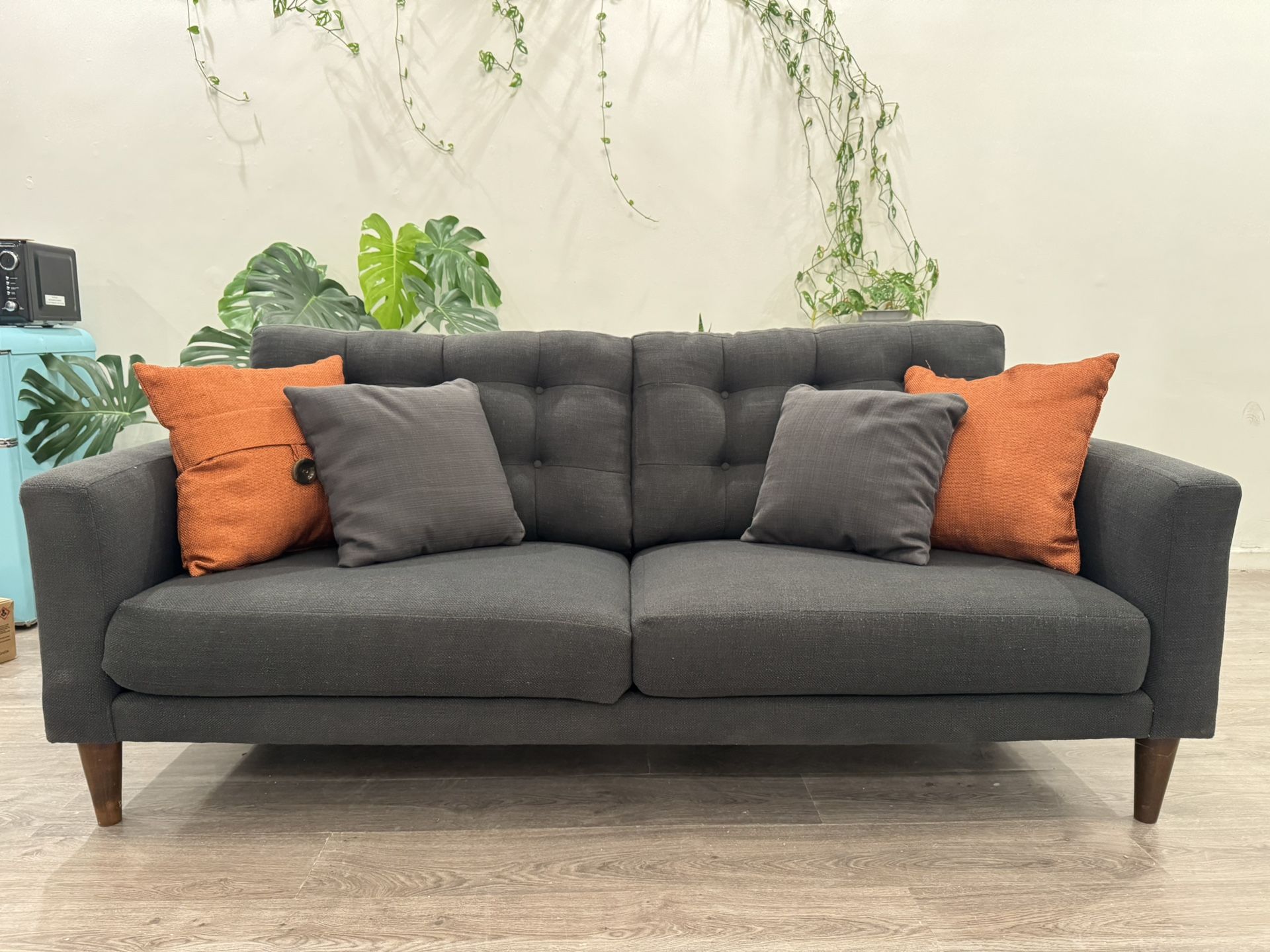 Freshly wet-vacuumed mid-century style gray sofa. Clean, comfy, and in good condition. Includes pillows and features sturdy wood legs and tufted cushions. Moving and need gone ASAP — priced for quick pickup.