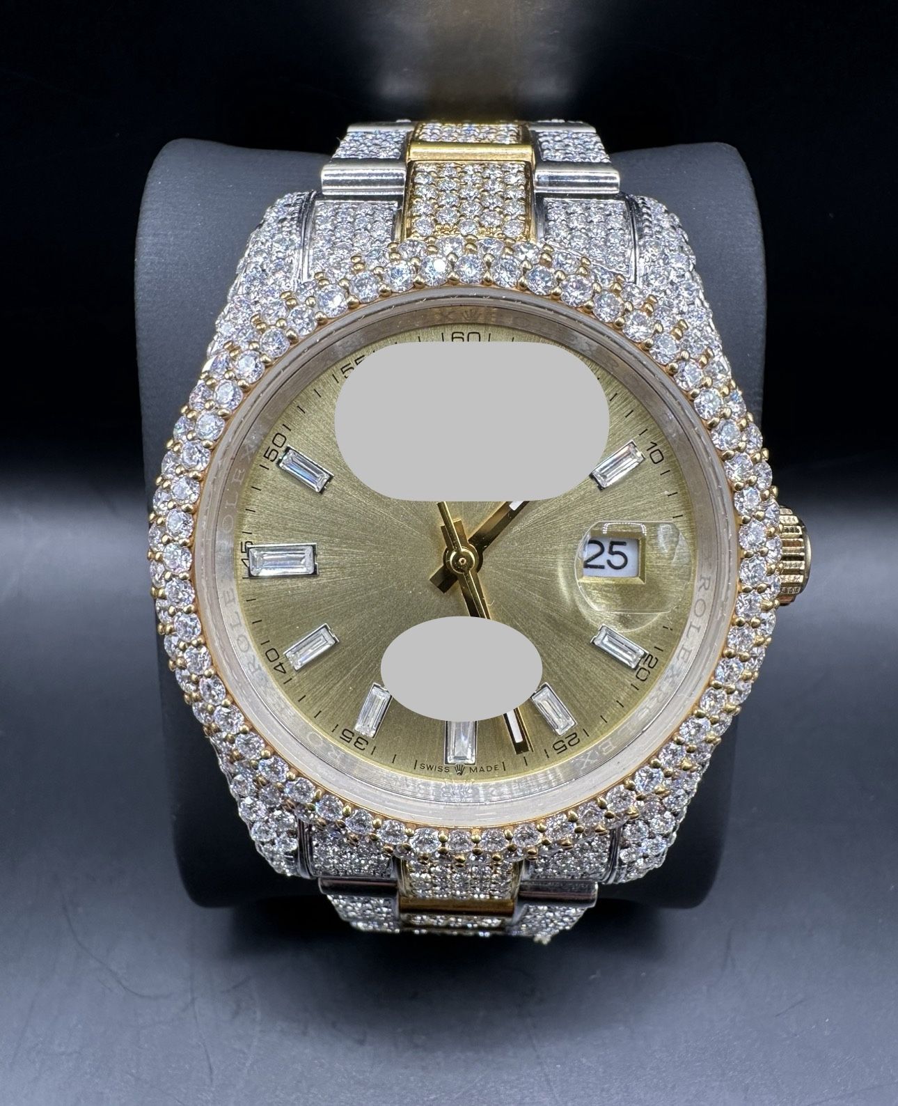 * RECEIVE A FREE PAIR OF 5MM 1.5 CARAT EARRINGS WITH PURCHASE* Stone: Moissanite VVS1 Grade : D clearest stone Stainless steel Includes box and papers Diamond tester approved Swiss movement Fits all wrist types . Comes with all watch links You can resize links at jeweler if need be . I can resize for you for a small fee . (Video and pictures upon request ) NO TRADES CASH PAYMENTS ONLY!