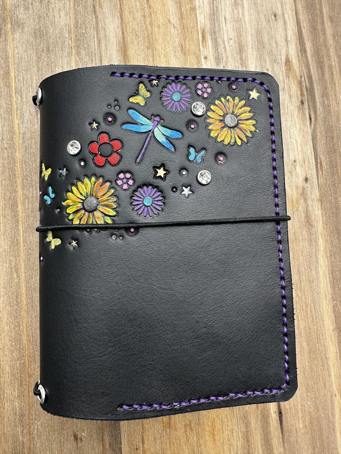 Local Artist. Colors inspired by the purples and reds blooming here in San Diego. Trifold A6/pocket size travelers notebook with hand tooled and handpainted butterflies, flowers, dragonflies and accented with crystals. Dyed black and handpainted. Interior has a full size pocket and two smaller credit card pockets. Hand sewn using a saddle stitch with purple waxed cord. A saddle stitch one of the strongest stitches and far superior to machine stitching. Silver eyelets added to make changing your elastics or adding charms easy. I give ample amount of elastic and tie loose so you can adjust the tension to your needs. Made using high quality 6-7 oz leather. This leather is thick and with use will mold perfectly to your notebooks and withstand all your life’s travels. Shown in pictures with four A6 size inserts to show it will hold lots of your inserts and accessories. For those that like to stuff a notebook full. **Includes one lined A6 insert** When open flat it measures 13.5 inches x 6 inches. Comes with 4 strong elastics inside to hold your notebooks and inserts and closes with a strong elastic. Holds field notes size pocket notebooks as well as A6 size. This journal is one of a kind due to handmade nature. Never mass produced and will be as unique as your life’s travels. Comes in a dust bag. If you have any questions please message me. I will always try to respond within 24 hours. Ships free in the US with tracking. ABOUT MY PRODUCTS: I create small, handcrafted leather goods built to last a lifetime. From keychains to travel journals, each piece is made from high-quality vegetable-tanned leather and carefully hand-tooled, stamped, dyed, and painted. No two items are ever the same—each one is a unique reflection of traditional craftsmanship with my own artistic twist. My work isn’t mass-produced; it’s made slowly and intentionally to withstand the test of time and hold up through all of life’s journeys, no matter how rough the road gets. Leather is timeless and will patina and soften with use into a well worn friend and not fall apart.