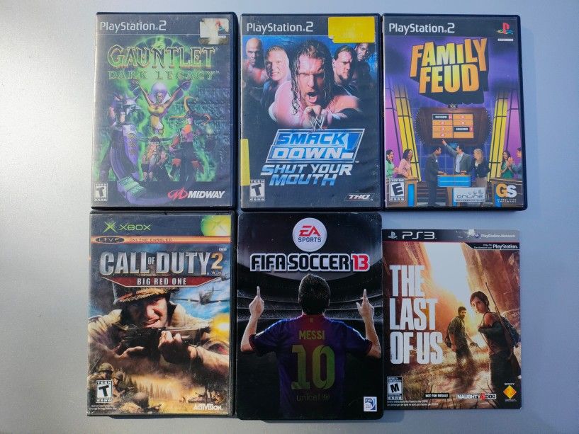 Hello I have about 12 games for sale that I will sell individually or will work out a deal if you take em' all but prices go as follows: PS2: •Gauntlet Dark Legacy complete w/manual $20 •WWE Smackdown Shut Your Mouth no manual $15 •Family Feud complete w/manual $5 PS3: •The last of us (Brand new) $15 PSP: •Monster Hunter 2 Freedom $10 •Kingdom Paradise $10 •Final Fantasy Tactics $10 •Loco Roco $5 XBOX: •Street Racing Syndicate $15 •Call Of Duty 2 Big Red One $10 XBOX 360: •FIFA Soccer 13' Steel Book Edition $15 XBOX ONE: •Rory Mcilroy PGA Tour $5 NO TRADES, be cash ready please and meet up or pick up in Modesto only. Any?'s feel free to ask thanks for looking.