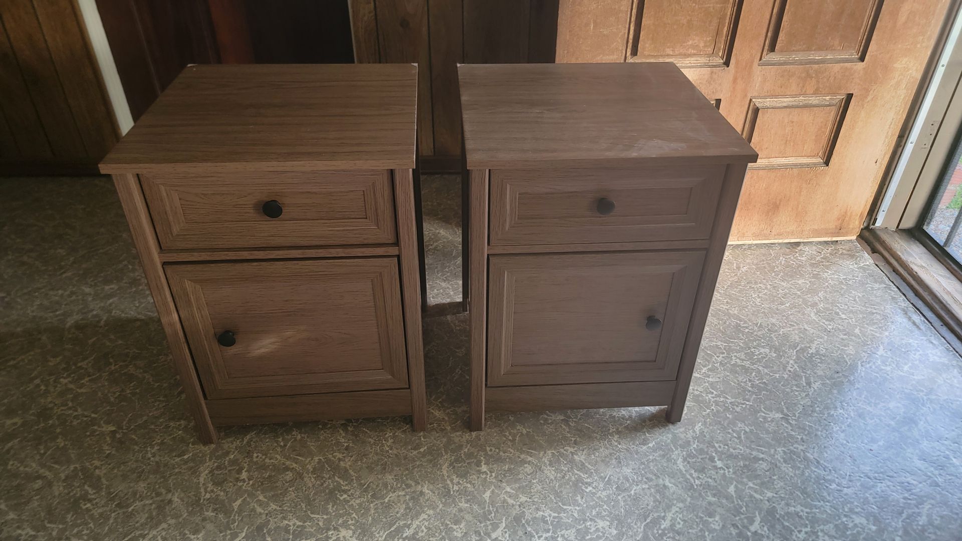 These nightstands are free to take if you're interested. They are in very good shape and just have a small top corner nicks in the corners. 24" high 17 1/2" depth 17 1/2" wide