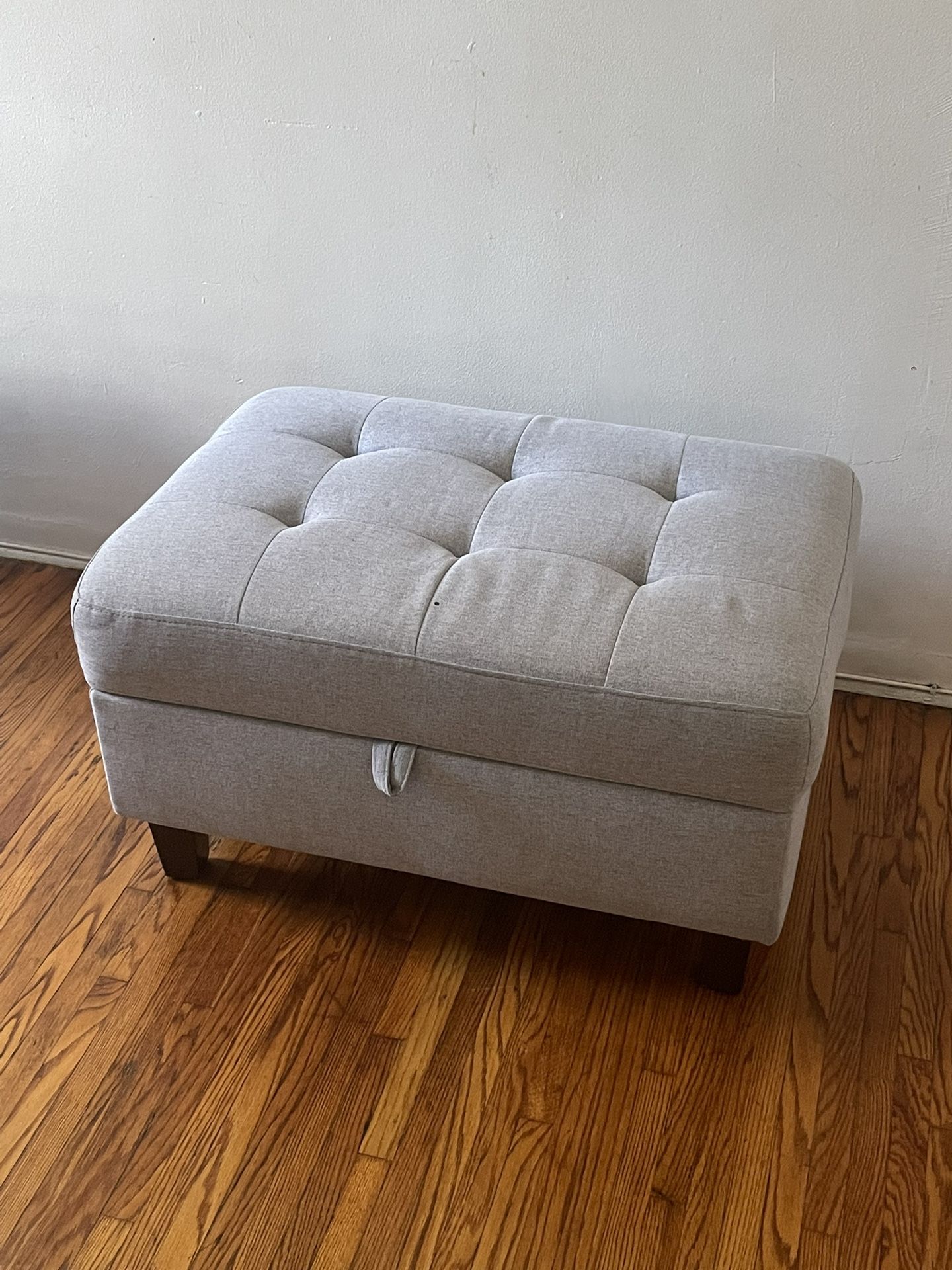 22”D x 33”W x 18”H Nice comfy grey fabric ottoman with wooden legs in good condition. Dropped a match while trying to light a candle (damage shown in last photo) $30 obo pick up ktown/ mid city
