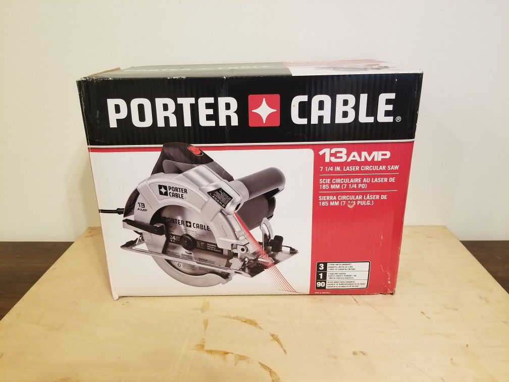 Porter-Cable 13-Amp 7-1/4 in. Laser Circular Saw (Model PCE300). Only used once and has been in garage. Motor: 13-Amp motor for power and durability. Blade Size: 7-1/4 inches. Features: Integrated laser guide for increased cutting accuracy and a steel shoe for stability. Capacity: 45-degree bevel capacity for various cutting applications.