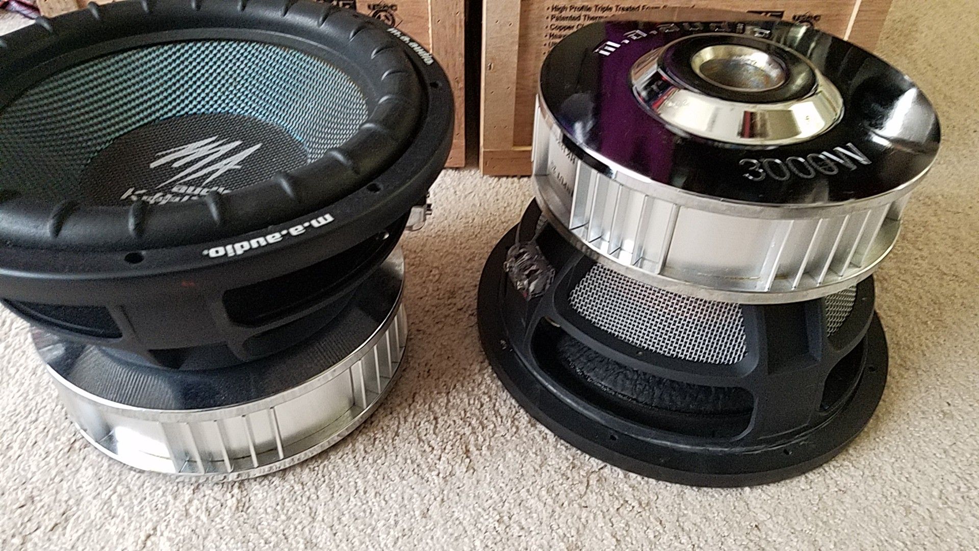Brand new in creates is a pair of Ma audio HK 12's in custom vented box. Subs are 1500 watts rms ea 3 inch voice coil dual 2 ohms 240 oz magnet. Box custom built 5.3 cuft total tuned to 32hz double faced.