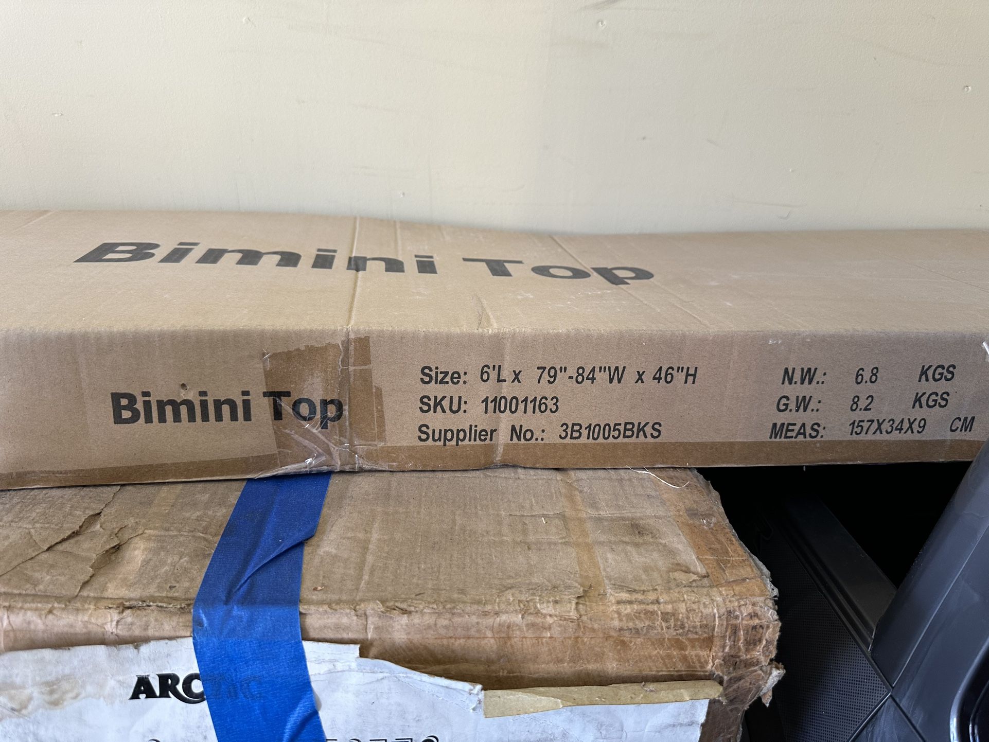 Bimini top boat cover. Never opened/ used. 6 L by 79-84 W by 46 H. Black