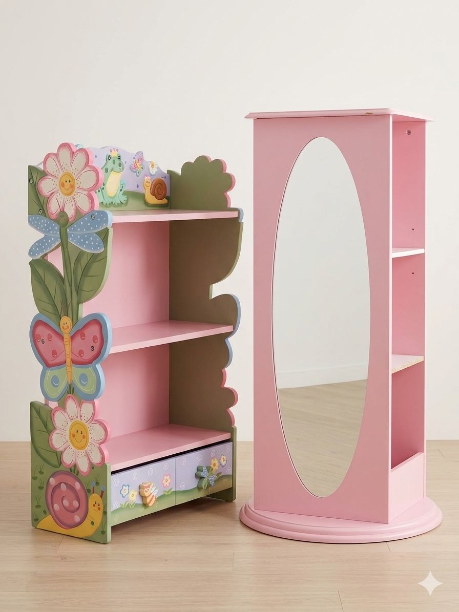 Very cute and high-quality kids furniture set made of real solid wood (not cheap pressed board). Sturdy, heavy, and built to last — not flimsy at all. Perfect for organizing toys, books, dolls, and dress-up items. Bright, attractive design that looks adorable in any child’s room. Rotating Storage Tower with Mirrors • Smooth rotating base • Two mirrors • Hanging area for dress-up clothes • Multiple shelves for toys, books, or accessories • Very stable and well-built Dimensions: • Height: 42 inches • Width (base): 22 inches ⸻ Decorative Wooden Shelf with Drawers • Solid wood construction • Bottom drawers for extra storage • Open shelves for toys and books • Cute colorful design • Strong and sturdy Dimensions: • Height: 38 inches • Width: 22 inches • Depth: 11 inches
