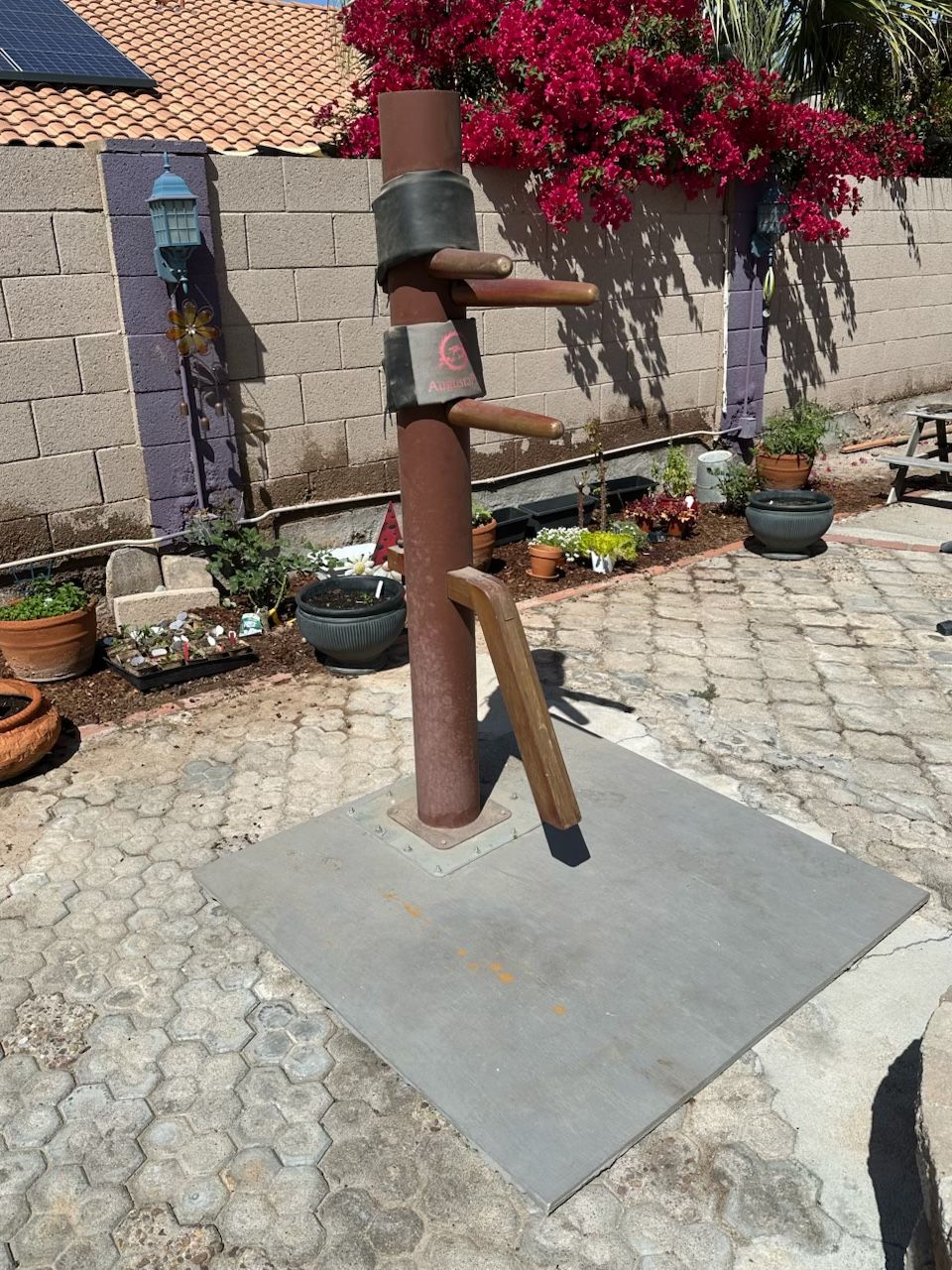 Mook Jung wooden exercise dummy on wooden platform for stability. This unit has been store for a while but is in good shape.