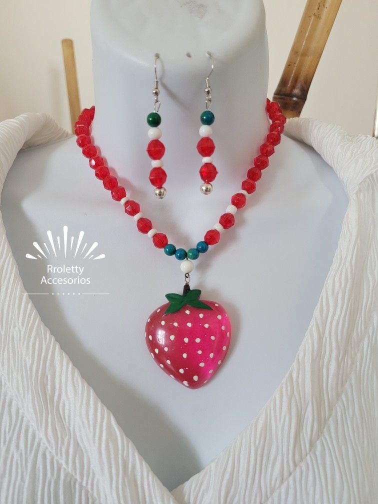 Necklace And Earrings Vintage With Huge Strawberry Pendant.