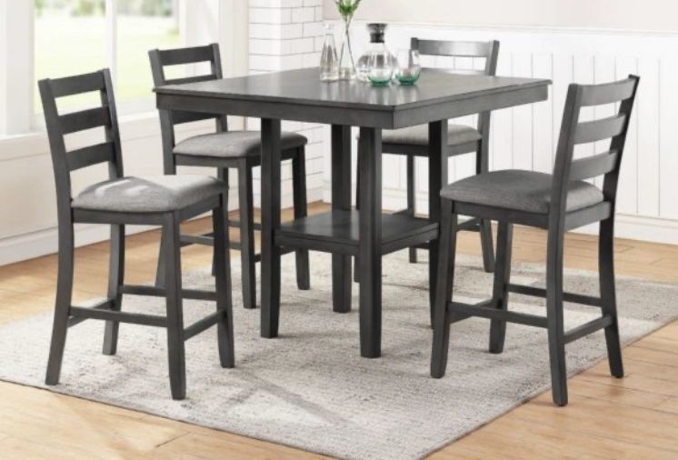 A 5-piece casual dining set that fits in your kitchen or dining room is just the perfect match for you. Featuring a rectangular shaped table and matching chairs in grey, this creates a lovely dining experience. Item # F2552 Materials: MDF with Mindy veneer + Solid Rubber wood + Foam Cushion with Fabric Upholstery Dimensions: Table: 32″ x 32″ x 36″H ; High Chair: 17″ x 21″ x 39″H Some Assembly Required