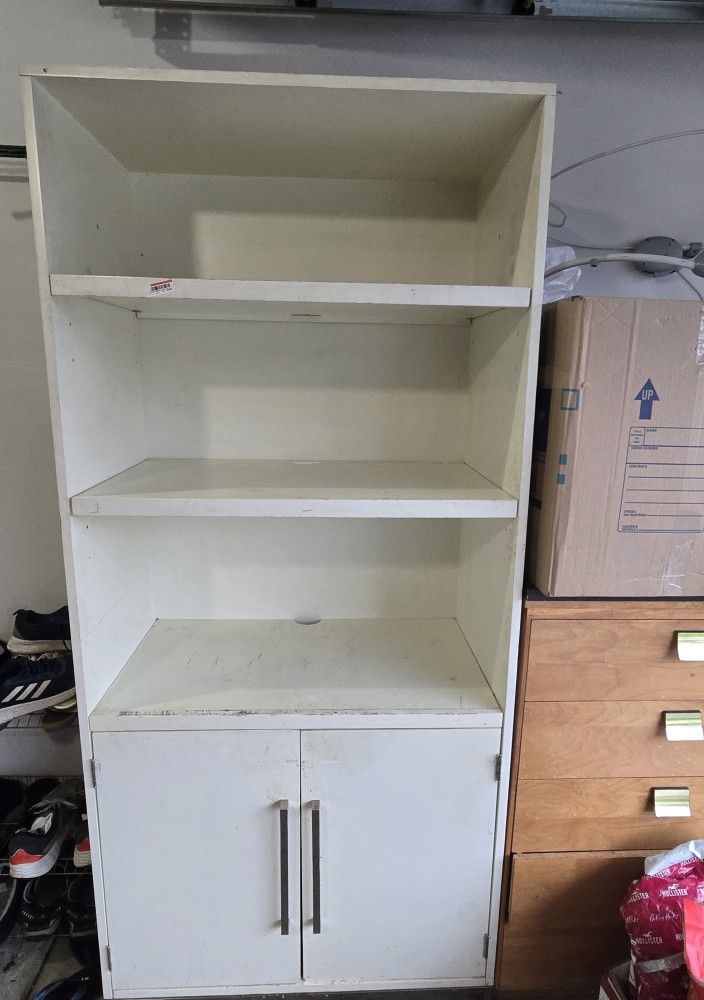 White book shelf with doors along with steel handles. It has solid steel frame at the base. The furniture is very strong. I was using for regular storage in my garage. Shelf heights are adjustable. Dimensions: 34"x19"x75"