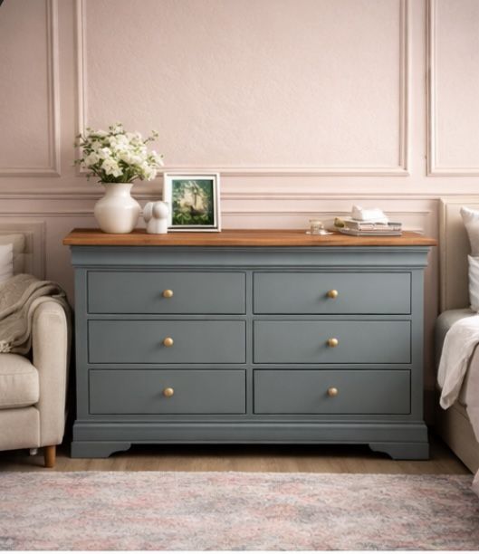 Beautiful dresser, professionally refinished and styled to fit perfectly in a modern, farmhouse, or cozy bedroom. This piece is both functional and timeless, with rich wood tones and a soft, elevated paint finish. Details: ✔️ Alderwood top, professionally stained in a warm walnut finish ✔️ Smooth-glide drawers ✔️ Elegant brass knobs ✔️ Sturdy, heavy, and built to last ✔️ Clean and ready for immediate use Dimensions: 📏 18.5” Deep x 62.5” Wide x 35.5” Tall Perfect as a bedroom dresser, guest room storage, or statement piece in a primary suite. Neutral and versatile enough to work with many styles while still feeling special. 📍 Pickup: Waddell 🚚 Delivery available for an additional fee 💰 Price: $375 obo (open to reasonable offers) Message me with any questions or to schedule pickup — this one won’t last long.