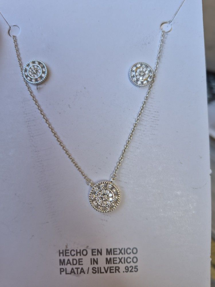 Sterling Silver Jewelry Set - Made in Mexico Beautiful sterling silver jewelry set that includes: Necklace with an elegant circular pendant and sparkling stones Matching earrings Genuine sterling silver Made in Mexico Refined and modern design Ideal for gifts, special occasions, or everyday wear
