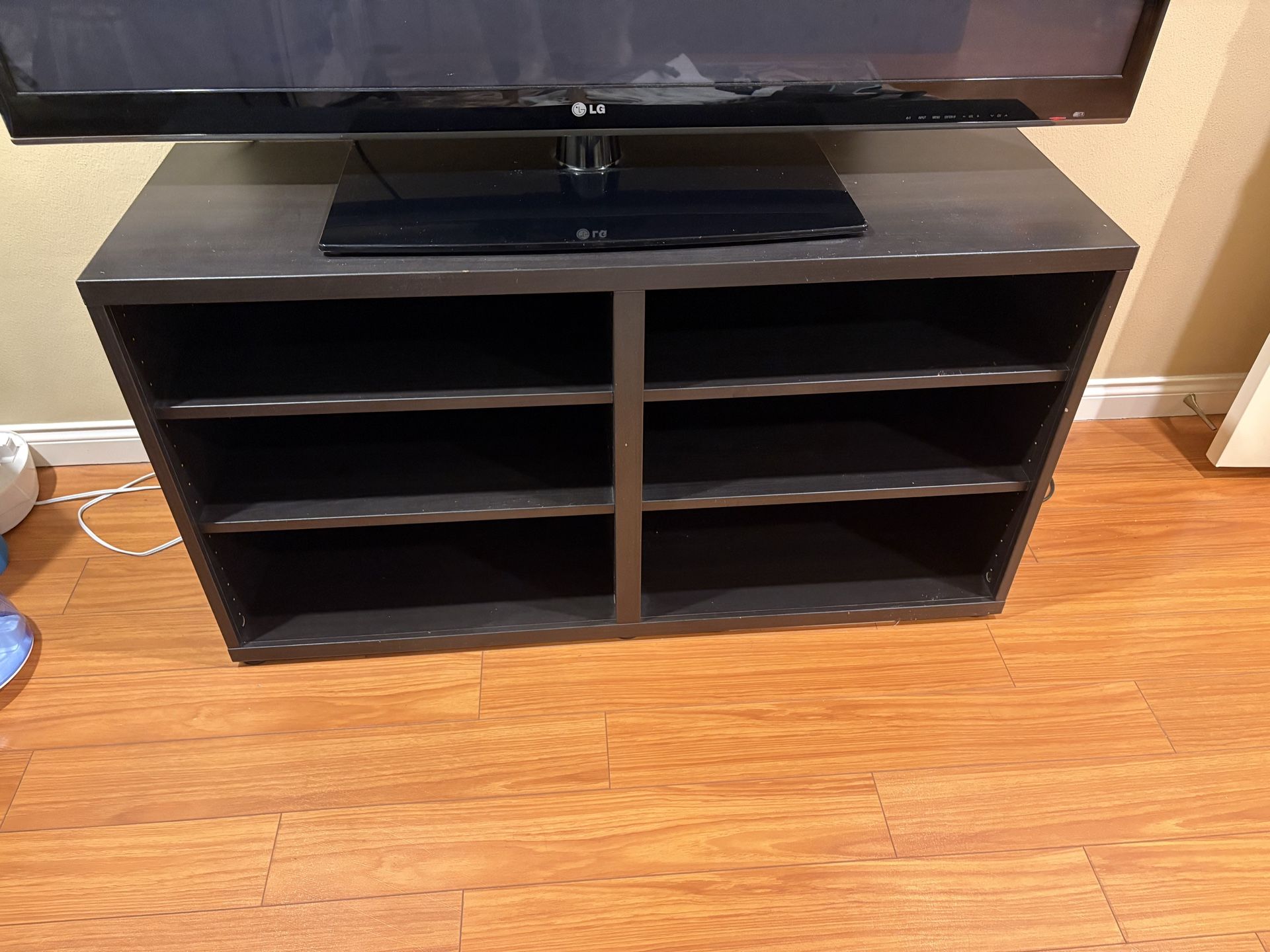 Tall, black / dark brown entertainment center with 6 storage sections - tv not included