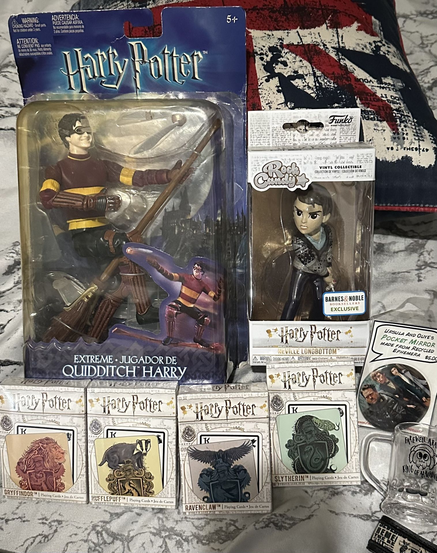 Hufflepuff back pack, condition as new. Hufflepuff cardigan, M. As new. Hufflepuff headband and tie, new 4 packs of playing cards still in plastic. One from each house. In package Harry Potter Quidich collectible. Free Dobby tote. Harry Potter cook book still in plastic wrap. Brand new in box hogwarts, 9 3/4 and HP tree decorations. Neville collectible, new in box. Compact mirror. Shot glass in box. Hufflepuff make up bag. Used. Pet and smoke free home. Feel free to sell items on. Would likely sell for much more individually.