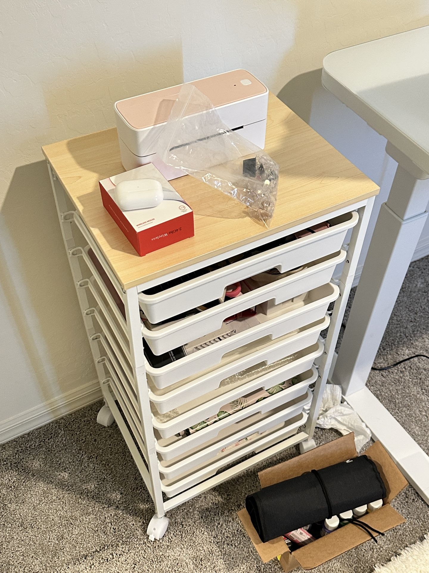 Great Condition Sturdy multi-drawer rolling organizer perfect for crafts, office supplies, makeup, or small items. Smooth-glide drawers and locking wheels make it easy to move around and organize your space. Features: • 10 sliding storage drawers • Metal frame + durable plastic drawers • Wood-style top for extra workspace • Smooth rolling wheels • Great for office, beauty room, or craft supplies Fully functional and in good condition. Pickup only.