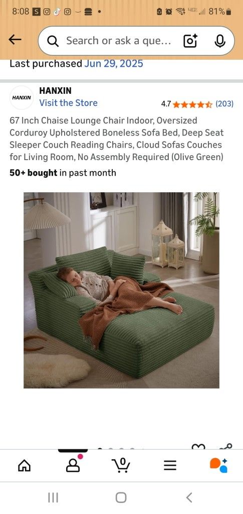 67" Chaise Lounge Chair Oversize Corduroy sofa bed in olive green. With extra pillows New out of box condition Retail 370.00 sell for 270.00 OBO