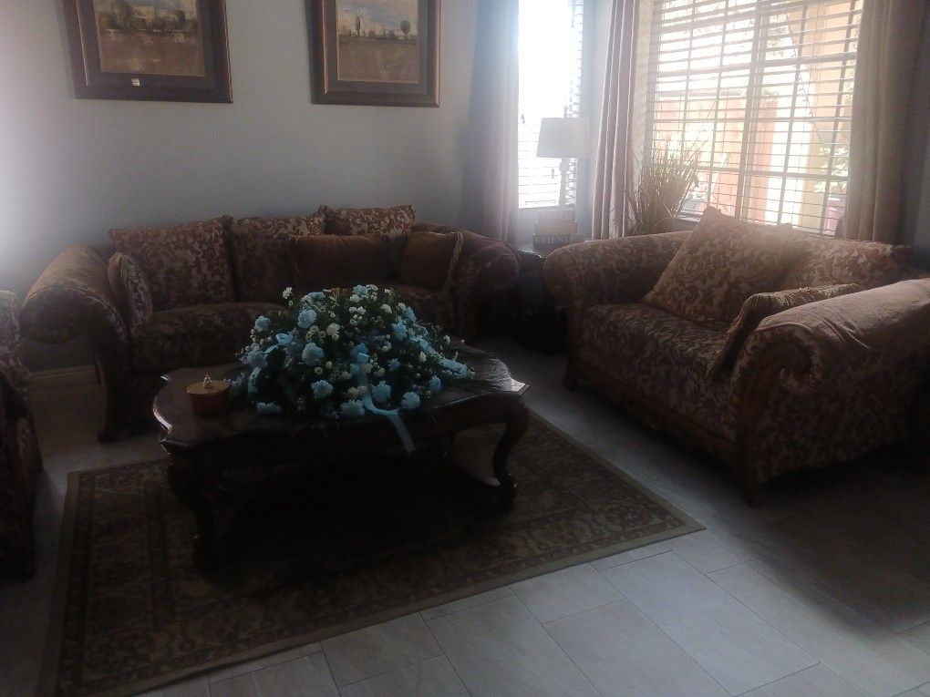 Sofa, love seat and chair, 2 end tables and center table.