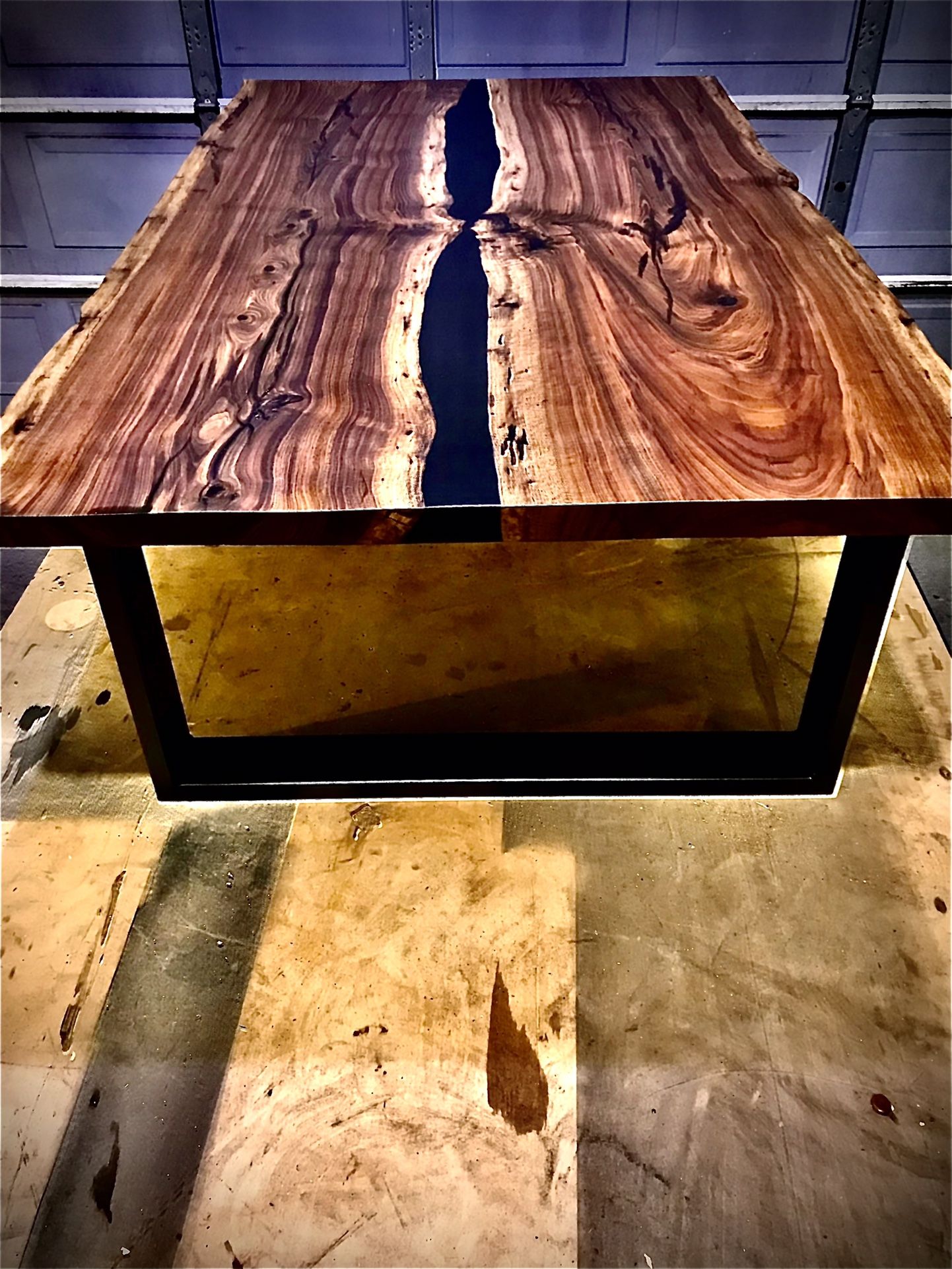 CLARO WALNUT, EPOXY, METAL. 100% handcrafted with 2 live edge Claro walnut slabs joined with epoxy. The metal legs provide a very stable base. Dimensions: Height 18”. Width 32”. Length 53”.