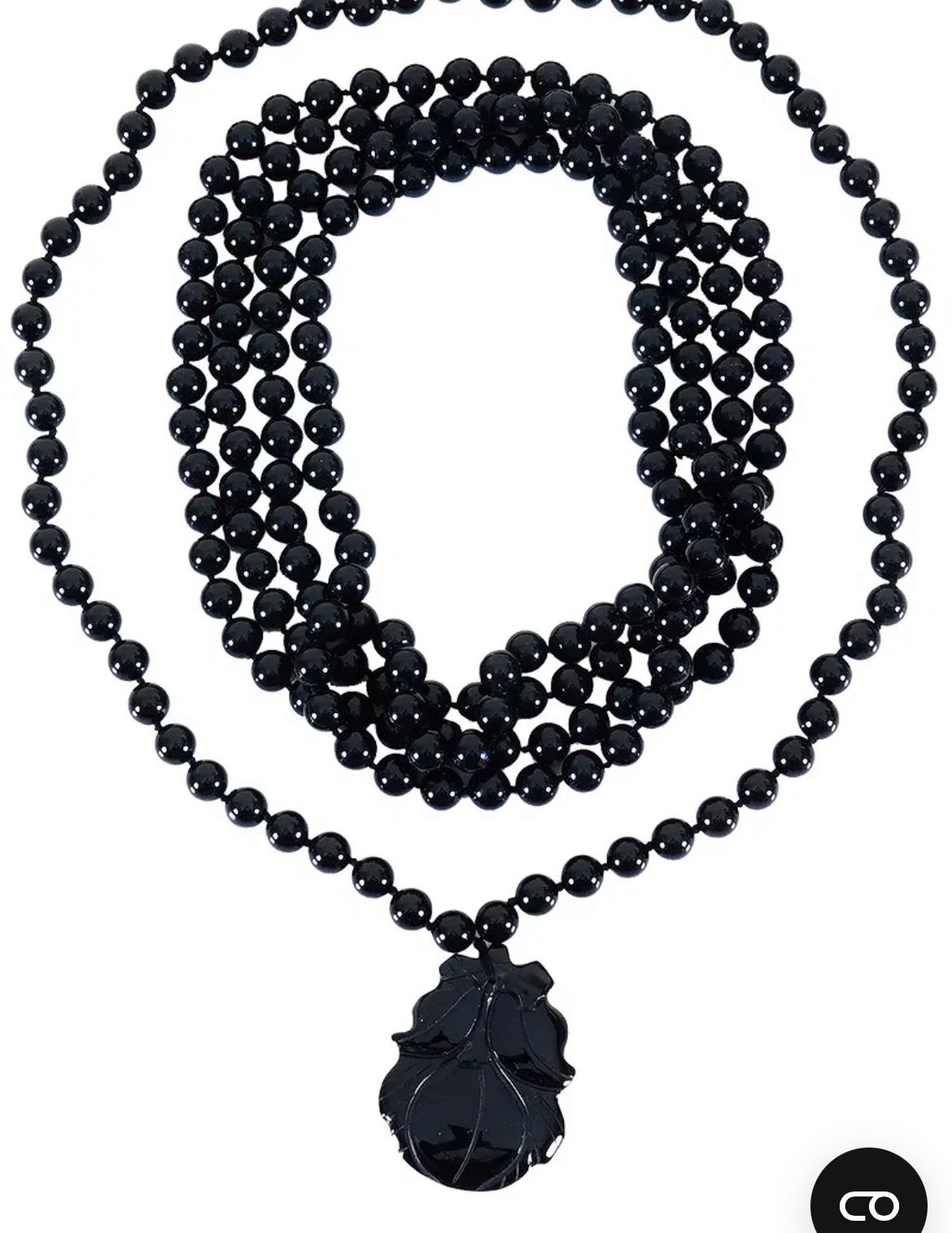 A lot of two vintage Chinese necklaces made from black agate beads. One necklace is a long strand of round agate beads. The second necklace appears to be a matching strand with an addition of a larger, carved black agate pendant. Vintage Chinese Jewelry. Dimensions Bead D 10 mm. Largest L 74 in. Smallest L 28 in. All measurements are approximate