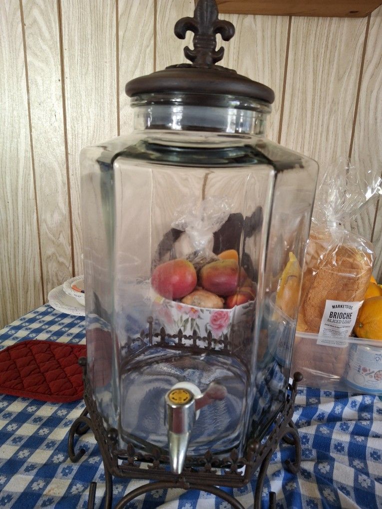 Large drink dispenser, used one time. Great for holiday parties, Xmas, Thanksgiving, birthdays, weddings. This is thick walled glass, no plastic! Silver drink flow dispensary. Ornamental lid with sealer around the edge for a tight seal. Bronze colored stand. Holds about 2 to 3 gallons
