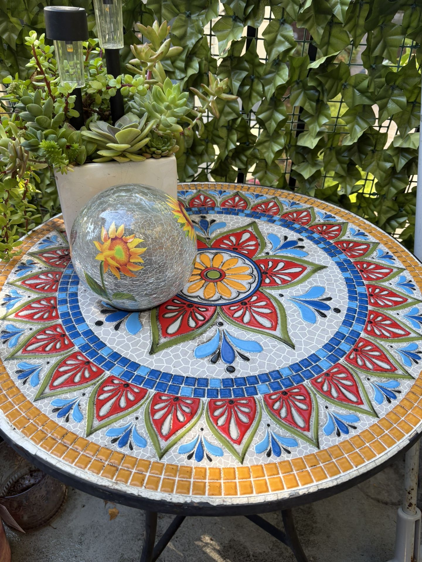 Cute small mosaic patio table Comes with two matching chairs and cushions Needs a wipe down and cushions need to be washed but in great condition Want to keep but I’m moving or I would Extremely cute perfect size for even a small patio