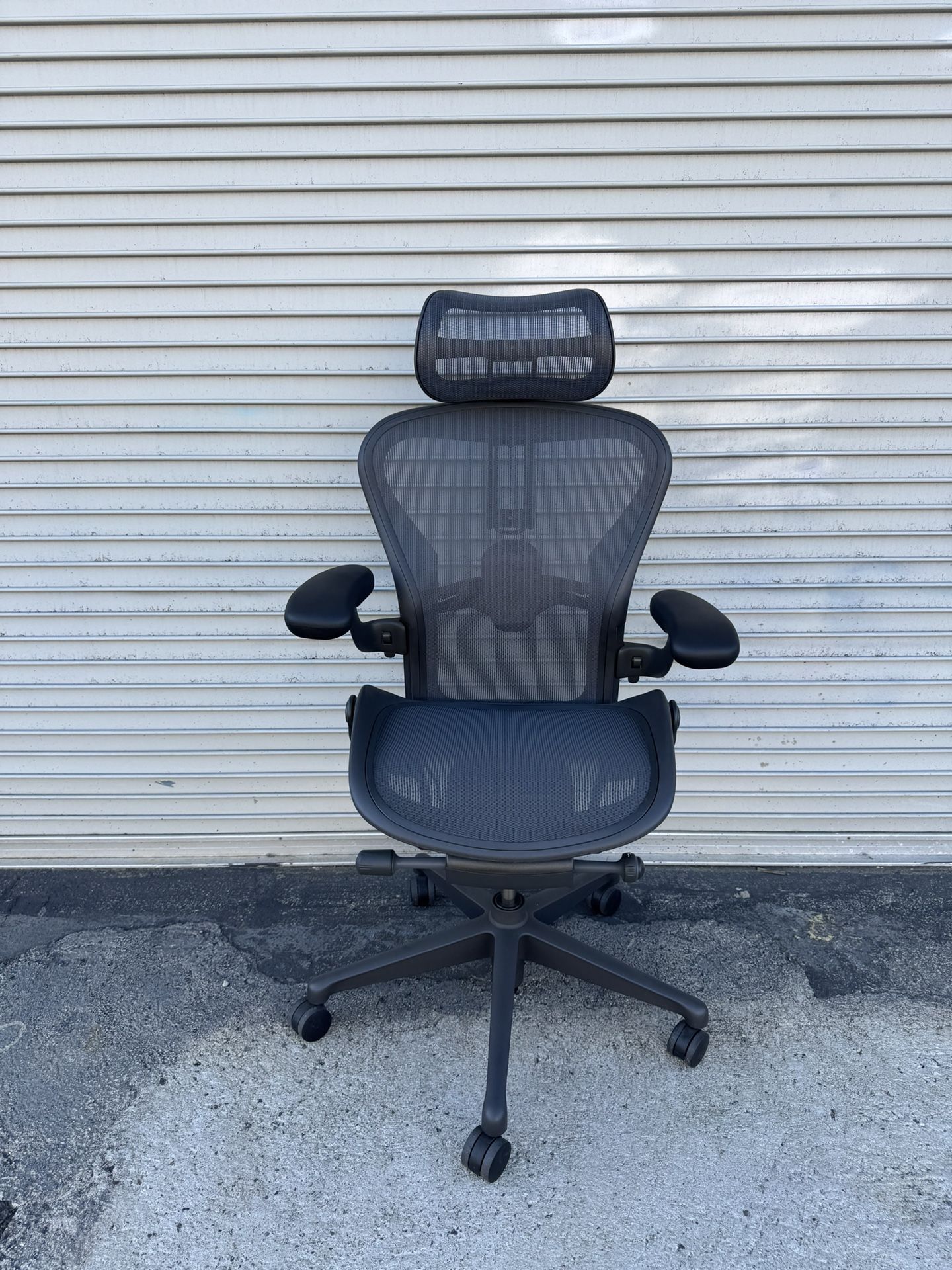 HERMAN MILLER REMASTERED AERON SIZE B CHAIR DELIVERY AVAILABLE FOR A FEE REAR TILT LOCK SEAT HEIGHT ADJUSTMENT LUMBAR SUPPORT PAD FULLY ADJUSTABLE ARMS CARPET CASTERS TILT TENSION ADJUSTMENT ATLAS HEADREST