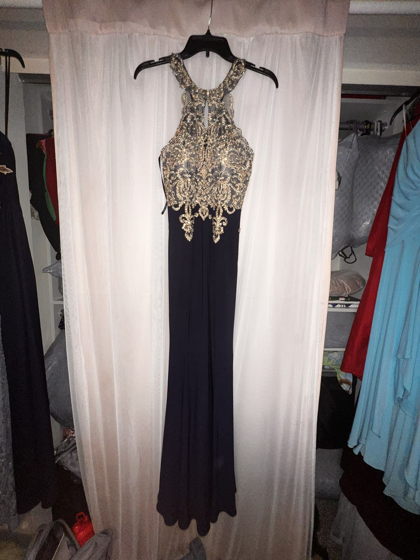 Only worn once and it great condition! Fit and flare, halter neck, and has a back zipper! Originally bought from macys, size 2