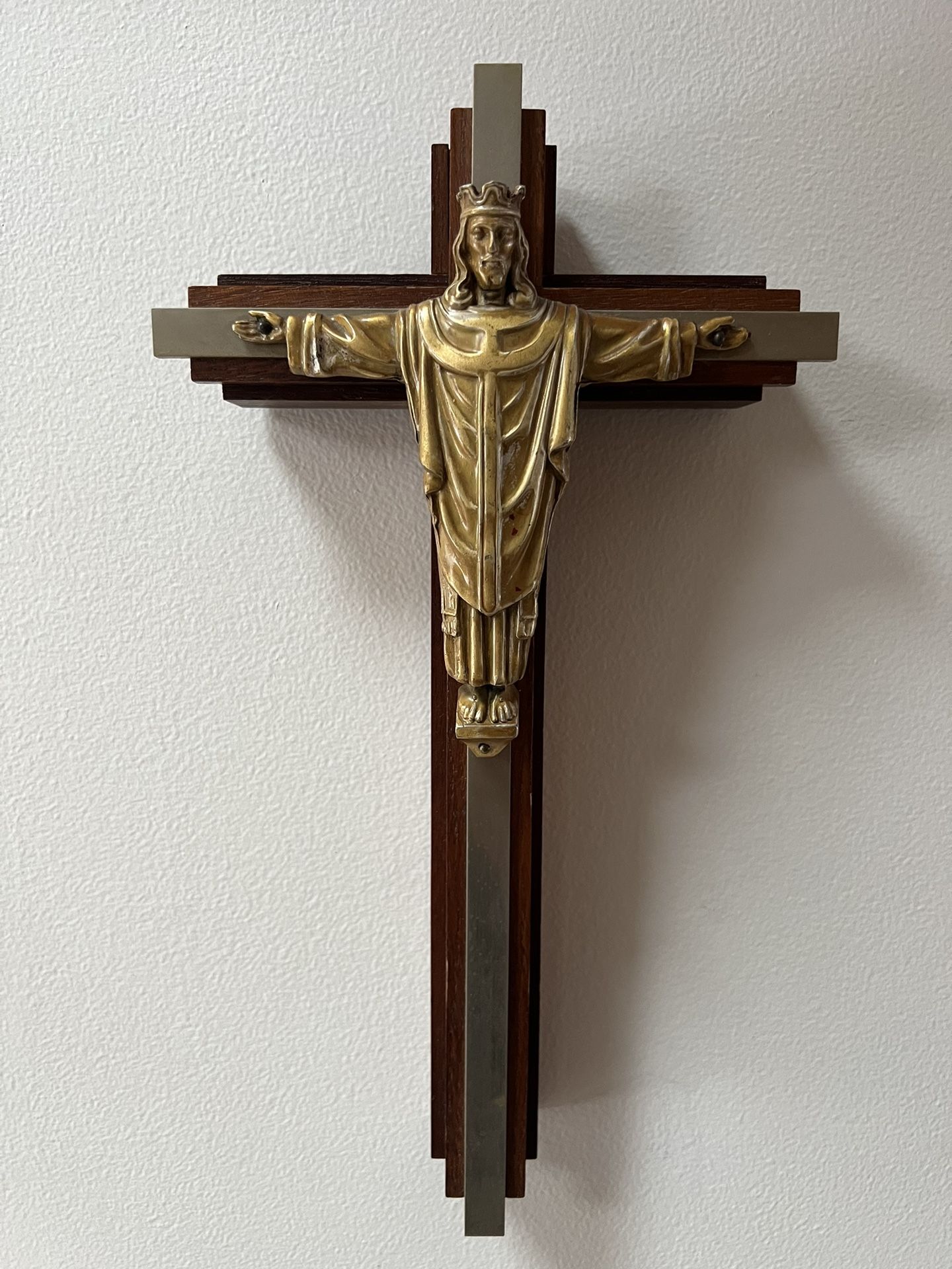 Used approximately 13.5”x 7.5” X 2.5” Cross with Gold Plated Corpus on wood. Used has minimal scratches that I can see. Please view photos for more details.