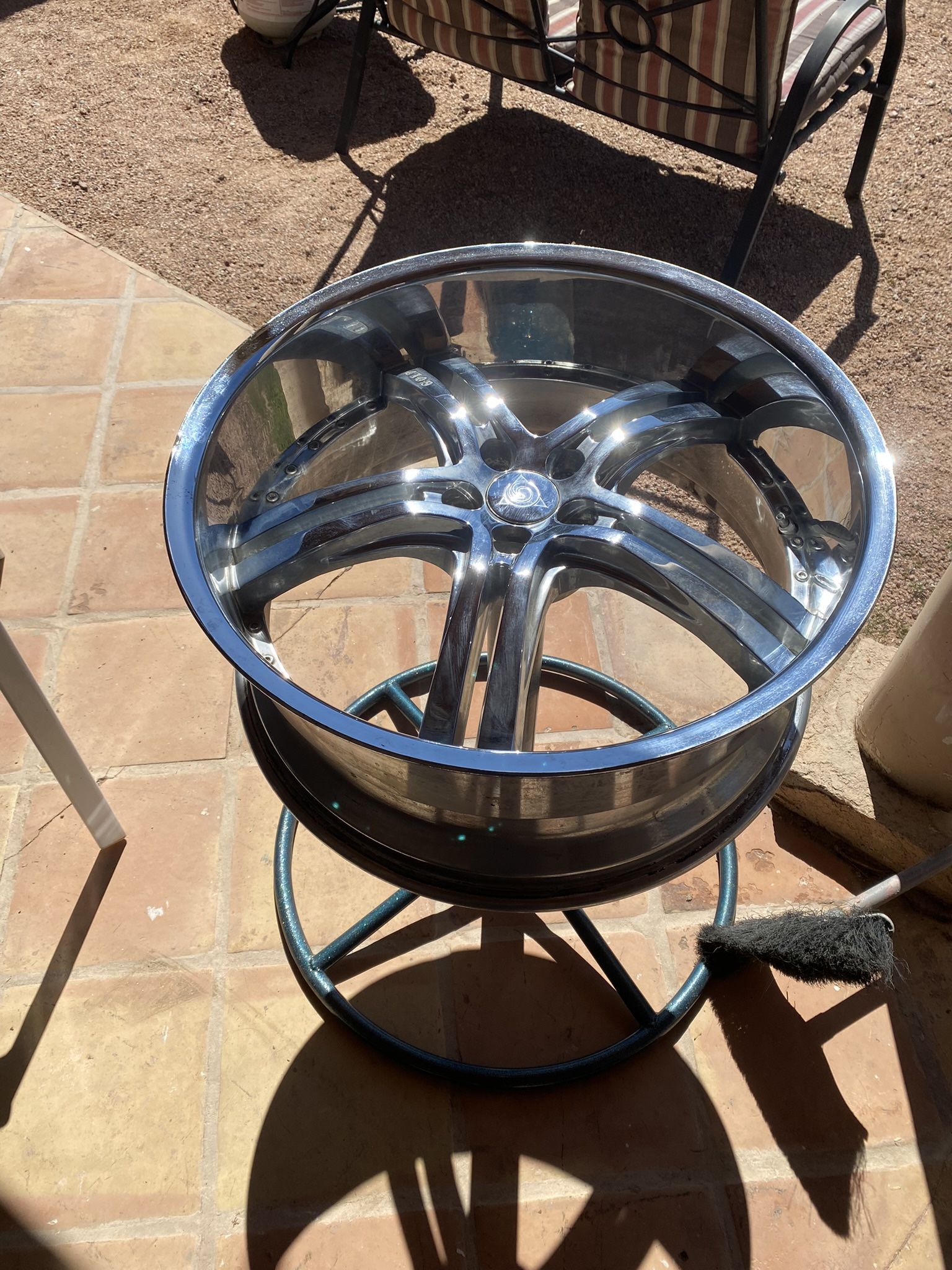 The base is painted teal with rainbow flakes with a 22” rim and has a 4’ round glass table. No room for it anymore.