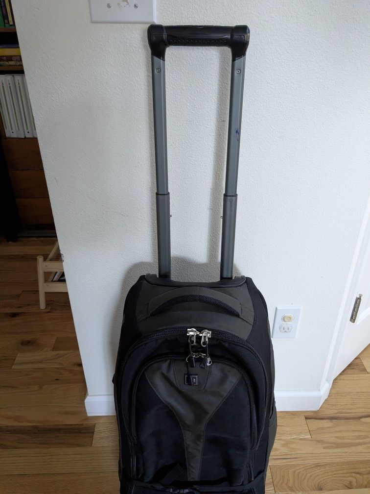 Very good condition. 23"H x 14" W x 9". Meet in Mill Creek. No low balling. Covert rolling suitcase to backpack in seconds!