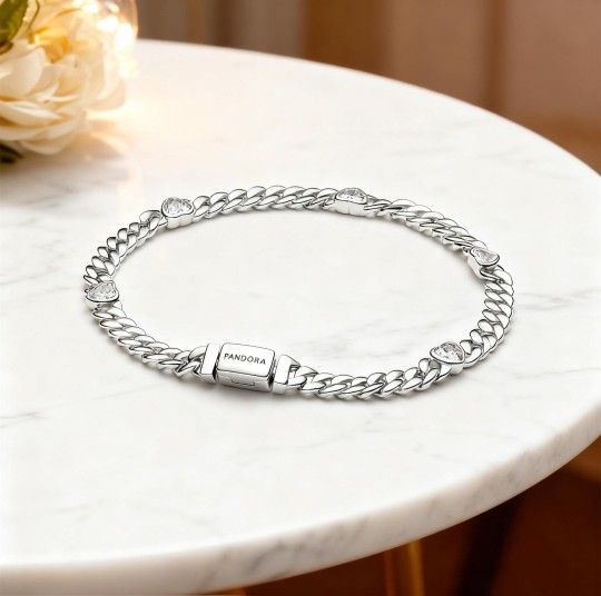 PANDORA HEART CUBAN CHAIN BRACELET. 7.8 inches long. Celebrate Love and Affection, with our New Pandora Sterling Silver Heart Cuban Chain Bracelet. Featuring heart-shaped cubic zirconia stones set in intervals along the bracelet. It opens by a snap clasp with our Pandora logo Engraved on both sides. Engraved Inside the clasp of this Stylish, Stunning Bracelet, is S925 and ALE to show its true Pandora authenticity. Purchase it while its still available, so you can wear it or gift it to a loved one, as a symbol of everlasting love, affection, beauty, and elegance. It makes the perfect Valentine's Day Gift! MATERIALS: ~CUBIC ZIRCONIA-, Flawless & loved for its multi-faceted sparkle. ~STERLING SILVER-, Our signature metal, loved for its cool, bright finish. DIMENSIONS: 2.5mm deep, 5.1mm high, 5.2mm wide ID- 594226C01-18 THIS AUTHENTIC PANDORA BRACELET IS NEW & COMES WITH A PANDORA BRACELET BOX & JEWELRY POUCH. IF YOU HAVE ANY QUESTIONS PLEASE DON'T HESITATE TO ASK! THANK YOU!