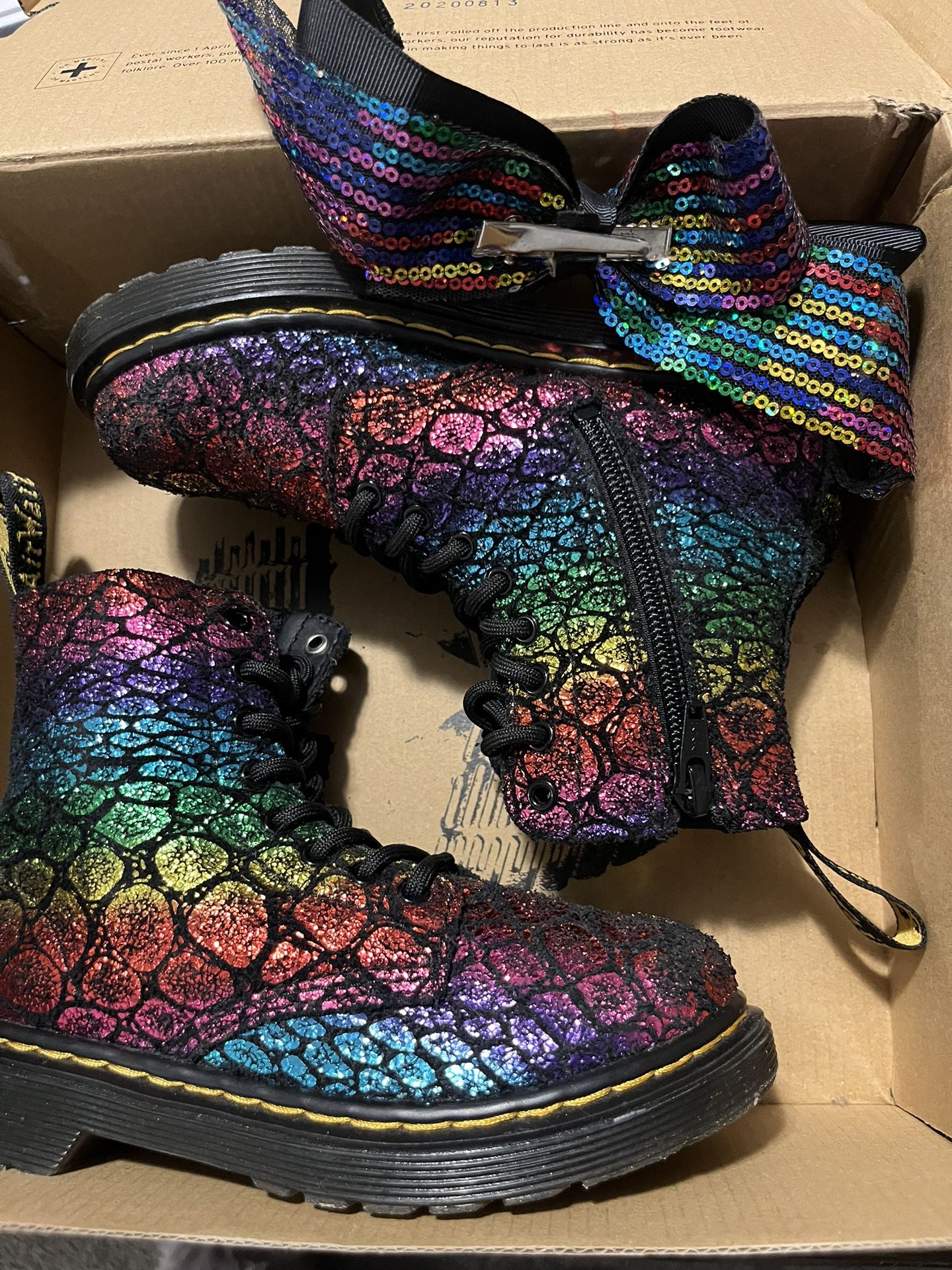 Size 12 Colorful Dr Martens Boots, with (a hair bow) $50 now $45 Dr Martens Black patient leather $95…$85.. $80 final price) Tim’s 2 pairs Black & Gold Both size 12.5 kids $65 each Both for $100.00 Tan / brown Bear paw size 12 $45 $50 off Tim’s size 3 kids ..$50 & $55 Some are in very good condition what size?