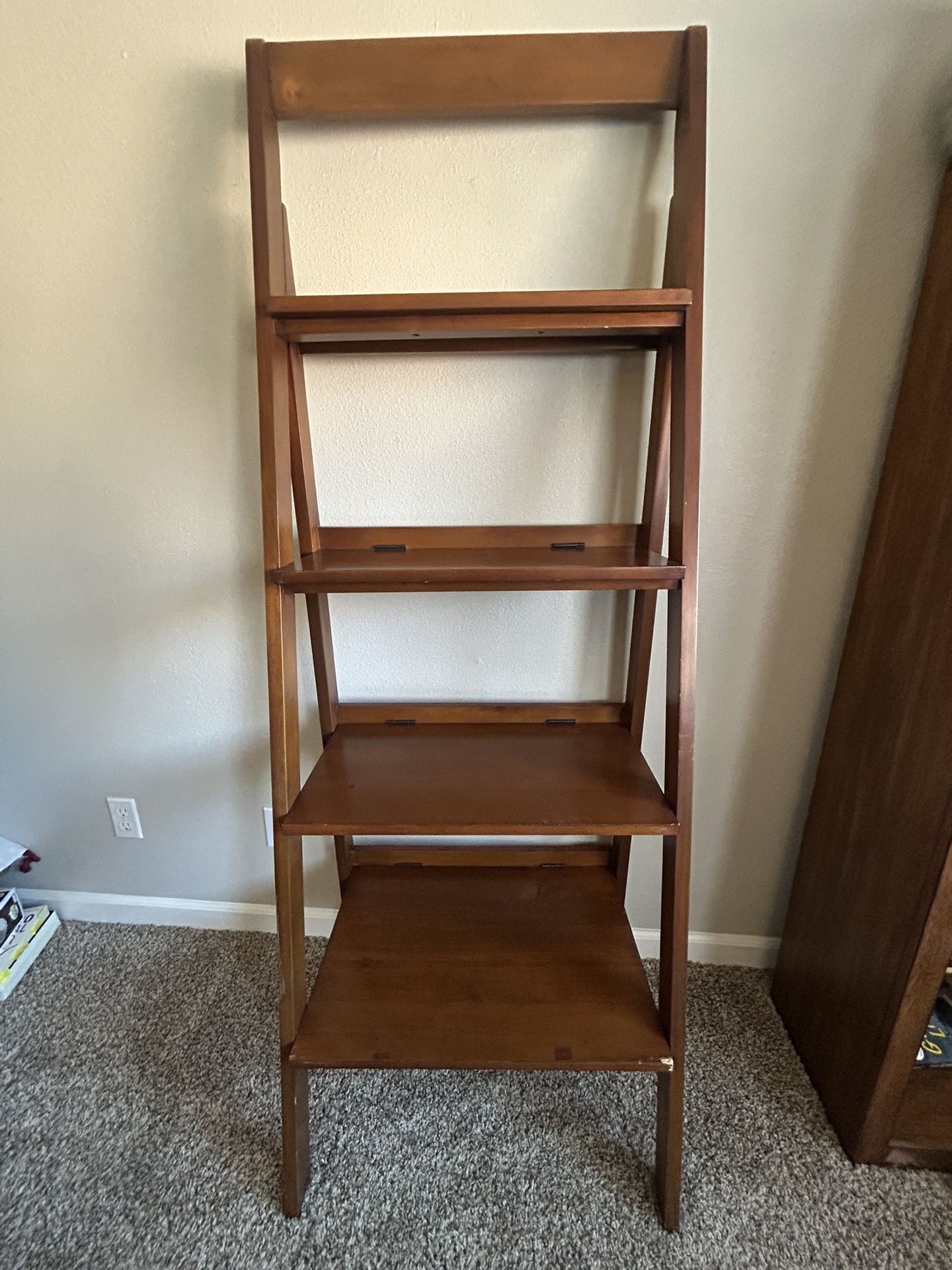 This ladder bookcase has gotten me so many compliments, but I’m moving cross country and everything must go! It’s a gorgeous piece! Please note cosmetic imperfections in the photos. NOTE: this has a matching ladder bookshelf and armoire that I have also posted Dimensions: 68” tall, 25” wide, 18.25” deep at the widest points