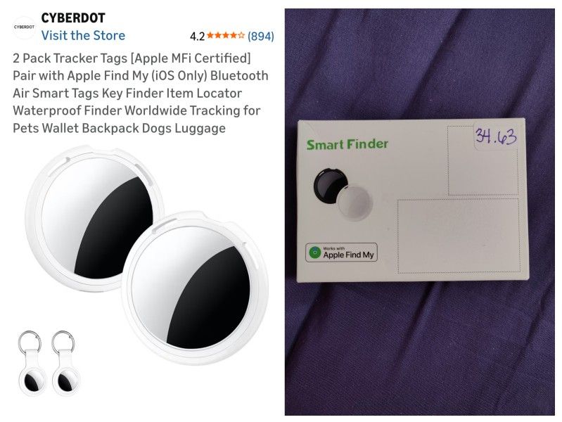Brand new, never opened. To pack of apple / iOS tracking tags. These are $34.63 retail price. I also have other tracking devices. Two four packs (10.81 and 43.29 retail prices) and also two single trackers for dog collars. ($29.22 each, retail)If I haven't posted them yet we can speak about those if you're interested. I believe they are cheaper than this two pack, but I'm not positive, I would have to look into it