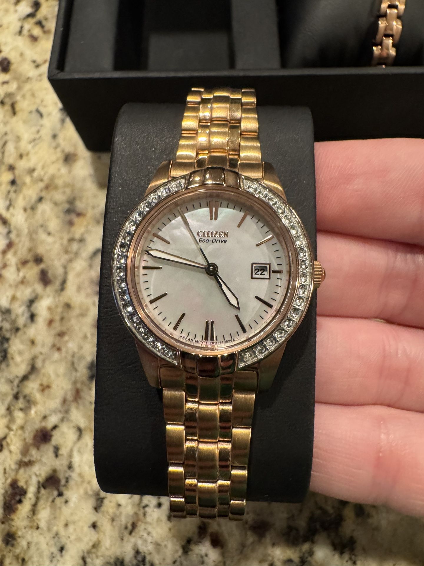 Ladies' Citizen Eco-Drive® Silhouette Crystal Accent Rose-Tone Watch and Bangle Bracelet Box Set NEVER BEEN WORN. Extra links for watch included. Comes with box From Zales website: The mother-of-pearl dial features rose-toned hands and markers and a date display. 28.0mm rose-toned stainless steel case with mineral crystal and a crystal-lined bezel The Japanese quartz movement keeps accurate time while the Citizen Eco-Drive® Technology harnesses the power of any light source. The link bracelet secures with a fold-over clasp. Water resistant to 30 meters, this watch includes a five-year limited manufacturer warranty, with an additional one-year warranty upon registering your watch with Citizen. The rose-toned stainless steel bangle shimmers with two rows of crystals and slips on and off for easy wear