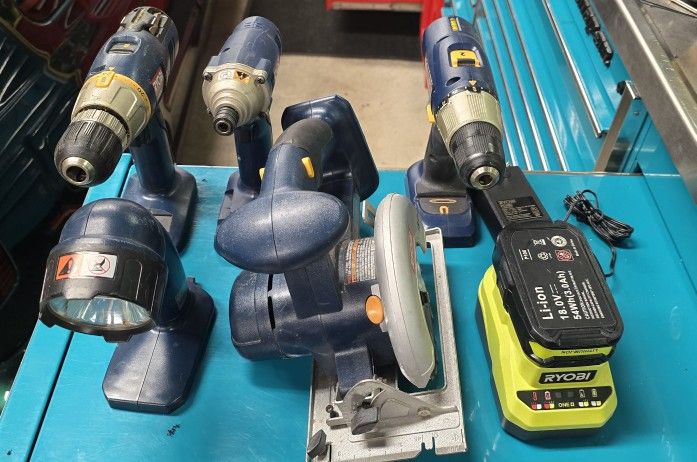 Ryobi 18 volt. Tools 1/4 inch impact drill 3/8 inch drill 1/2 inch.drill Saw, (could use a new blade) Light With charger and battery