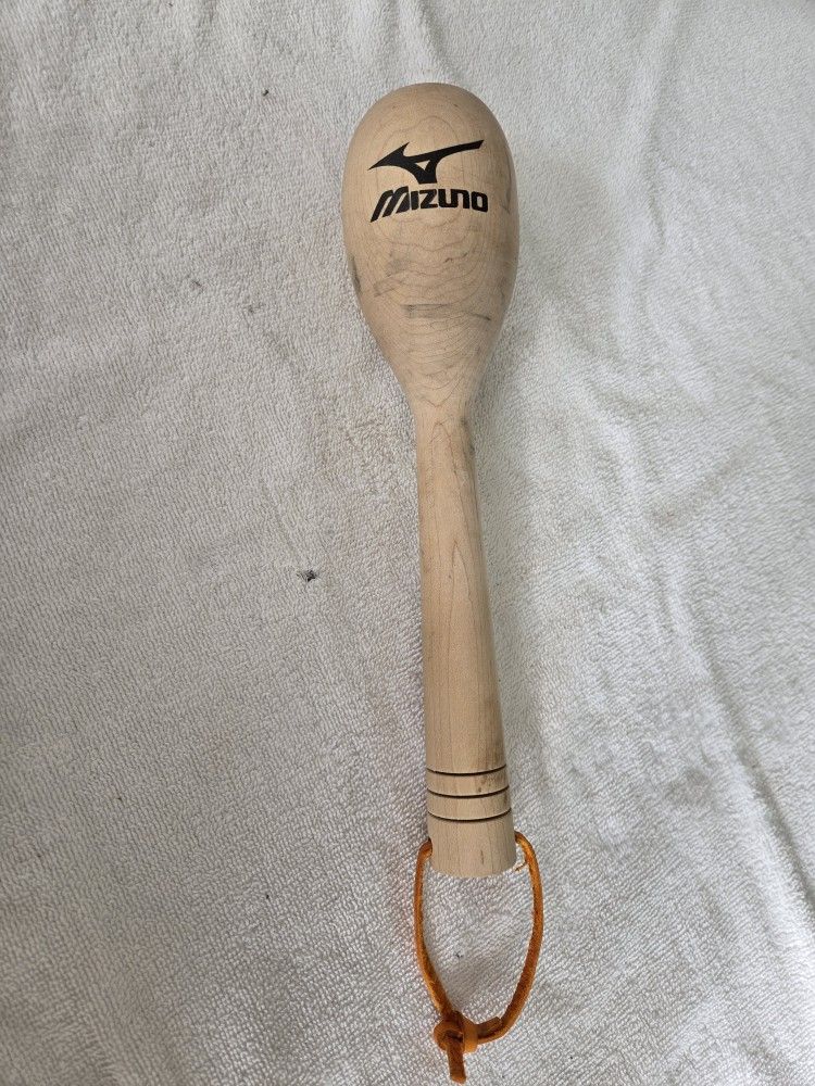 It is a tool used to help break in and shape a new baseball or softball glove. Made of solid wood. Designed to mimic the impact of a baseball. Features the Mizuno logo on the mallet head. The mallet is sized to fit a glove's pocket for accurate shaping.