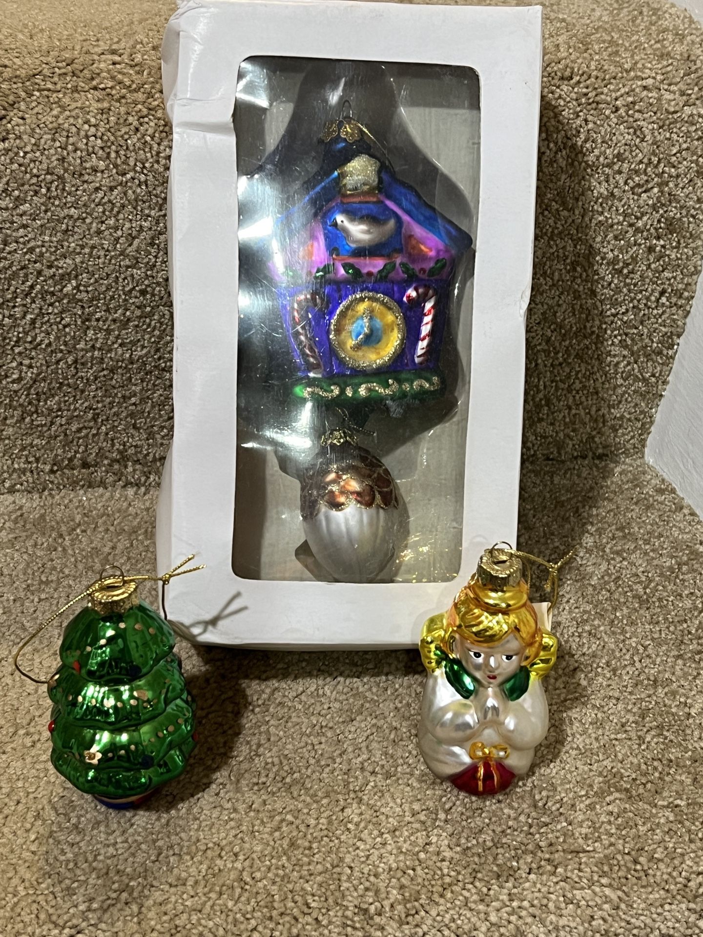 Christmas ornament lot of 3 Blown Glass Tree & Angel & Clock