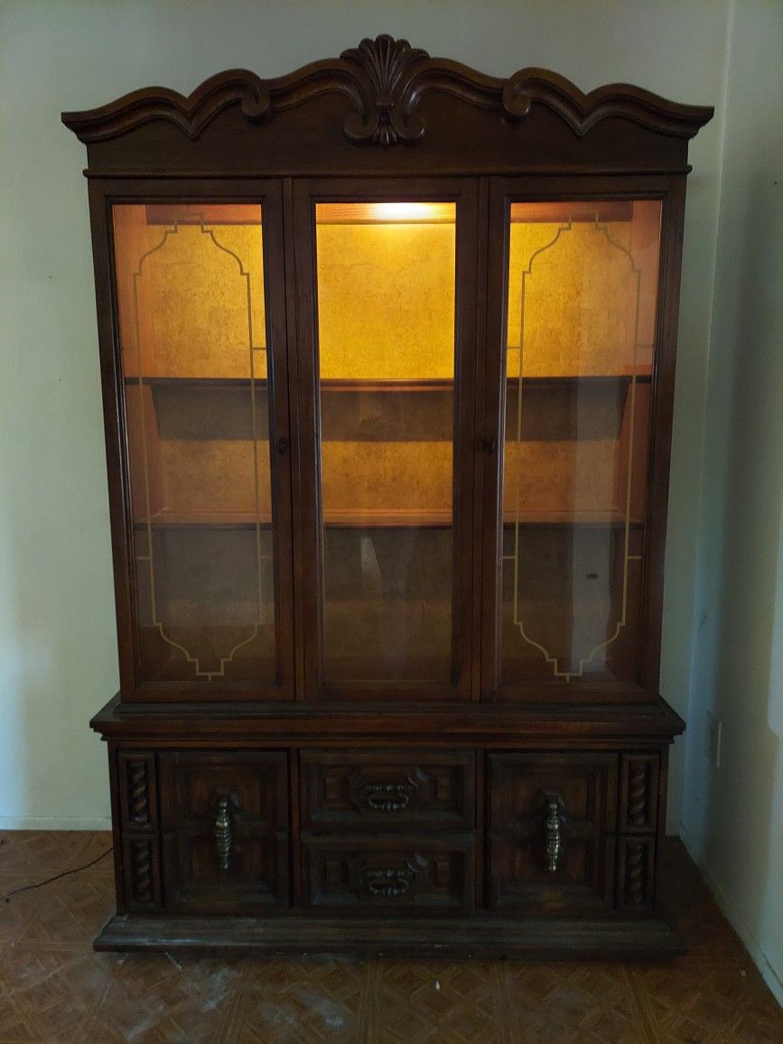 Dark wood, glass doors, dove tailed drawers, 51 inches wide, high 82 inches approximately and best buyer